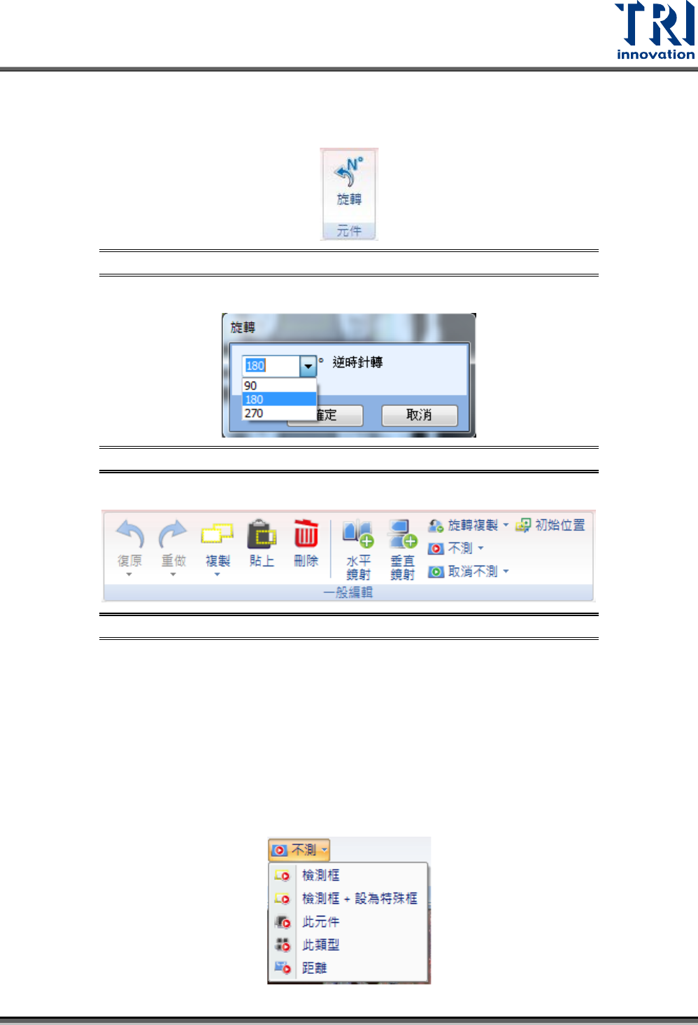 Test Research, Inc. TR7700Q E User Gu ide – S o f twar e 260 – 取消連結 ( 熱鍵 Ctrl+ L) :將已選擇的檢測 框解除父子關係。 – 改變形狀 :改變已選擇檢 測框的形狀由方形變成 圓形或者圓形變成 方形。 元件 圖 413 : [ 編輯 - 原圖模式 ] 頁籤面板 – 元件 – 旋轉:旋 轉已選擇的元件 ,可設定欲旋轉的角度 可直接下拉選單或 直接手動輸入。 圖…