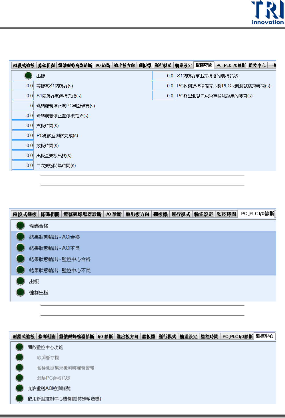Test Research, Inc. TR7700Q E User Gu ide – S o f twar e 286 6.1.1.9 監控時間 用來觀察各段的掃描時 間,以方便計算檢 測週期時間 (Cycle time) 。 圖 455 : 監控 時間介面 6.1.1.1 0 PC_PLC I/ O 診斷 圖 456 : PC_PL C I/O 診斷介面 6.1.1.1 1 監控中心