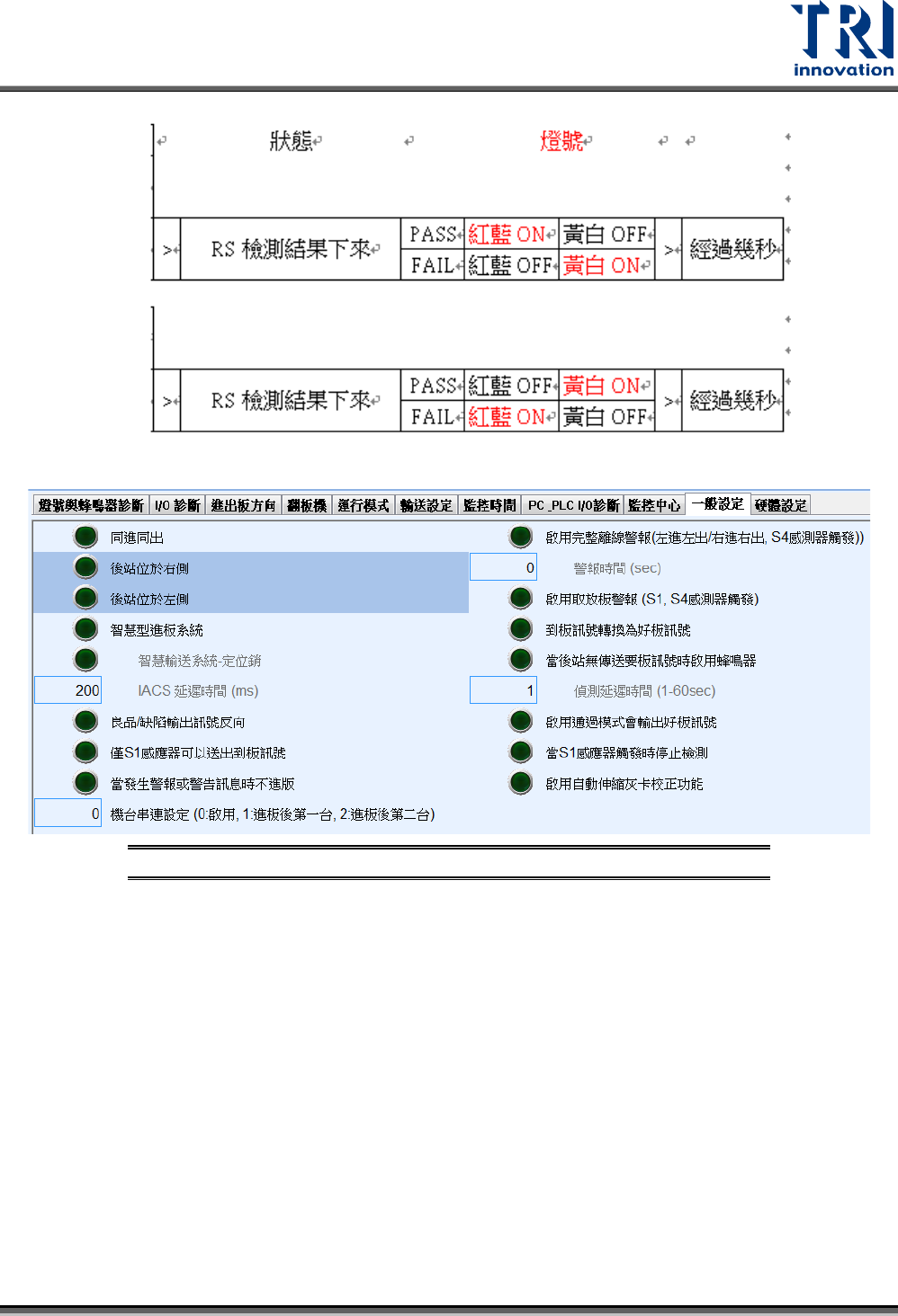 Test Research, Inc. TR7700Q E User Gu ide – S o f twar e 288 6.1.1.1 2 一般設定 圖 458 :一般設定 介面 同進同出:檢測完成出 板的同時,同步下 要板訊號讓進出板 同時作動,可節 省進出板時間。 備註:若使用此功能再 搭配條碼時,需啟 用預讀條碼功能, 否則條碼會對應 不上。 後站位於左 / 右側: 當有後站時,可以設 定後站所在的方向 。一般情況會依 …