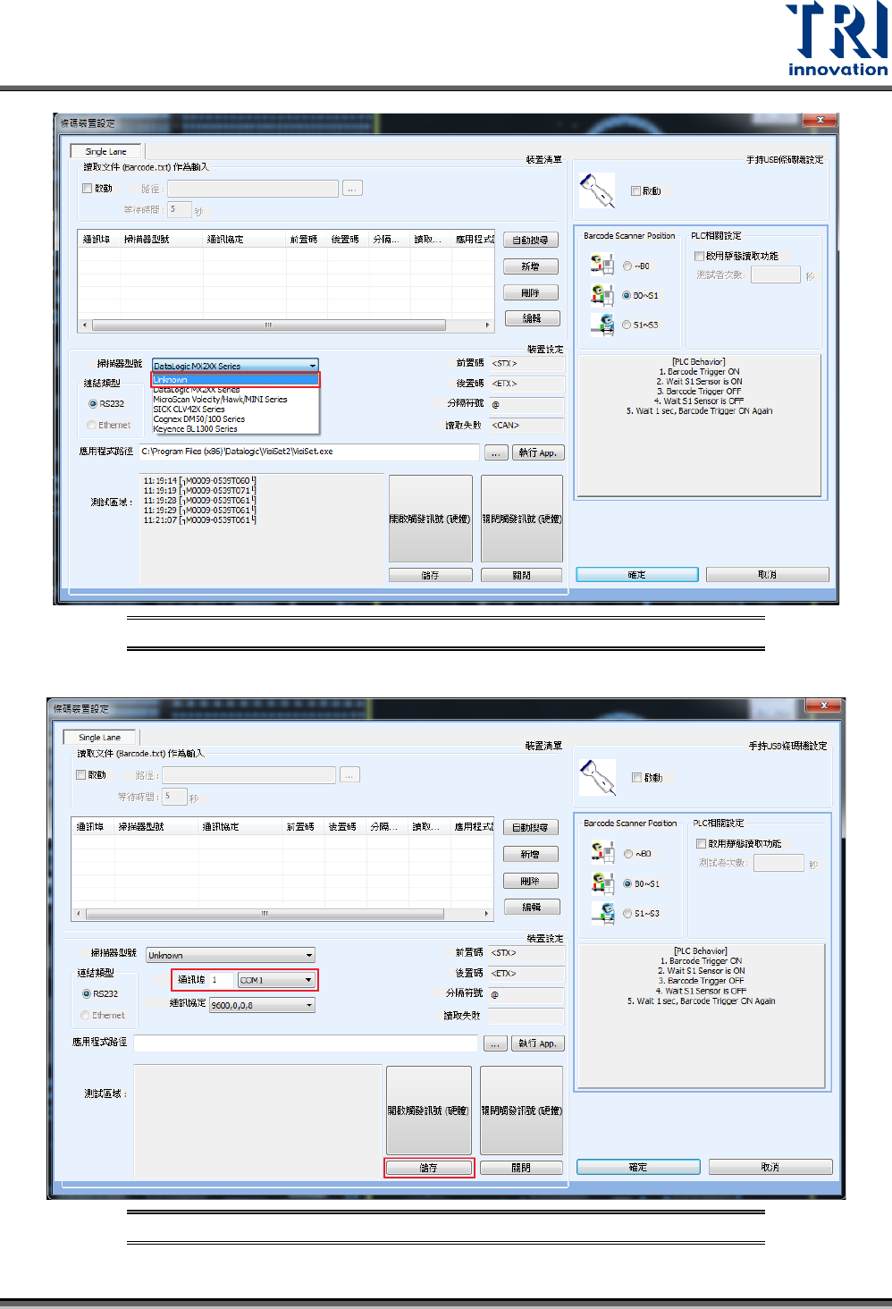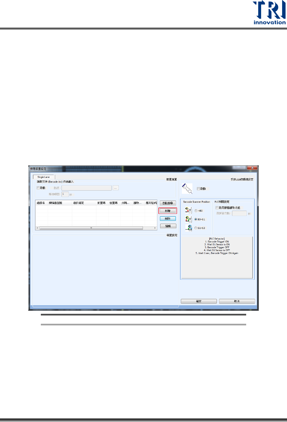 Test Research, Inc. TR7700Q E User Gu ide – S o f twar e 295 前置碼:必須判斷前置 碼、後置碼中間的 字串才是所需要的 資料。固定為 <STX> 。 後置碼:必須判斷前置 碼、後置碼中間的 字串才是所需要的 資料。固定為 <ETX> 。 掃描器類型:目前支援 Datalogic 、 MicroScan 、 Sick 、 Cog nex 、 K…