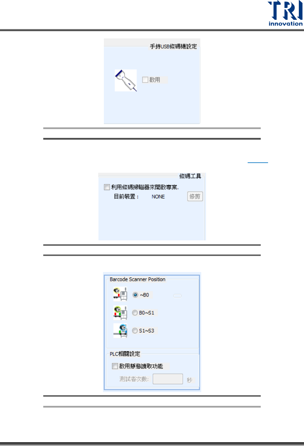 Test Research, Inc. TR7700Q E User Gu ide – S o f twar e 299 S1~S3 表示板子在機台進板 感應器 ( S1) 與夾板 感應器 (S3) 間條碼被讀取。 PLC 相關設定:是否開啟靜態讀 取功能,及設定 觸發秒數。 6.2.2 條碼設定應用 使用者可以先觀察板子 條碼排版的方式 , 再 來決定該怎麼建立檢測 框 。 單板: – Case 1 :單 板, 貼一個條碼…
