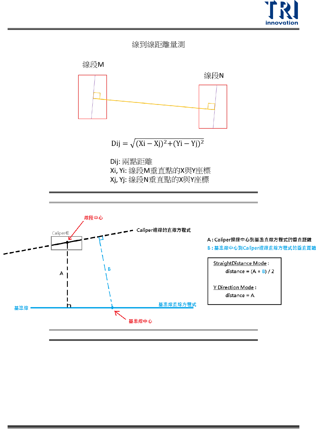 測框,會以 Caliper 框找出來的線的中心作為計算的邊界標準。三種距離的計算公式如下列