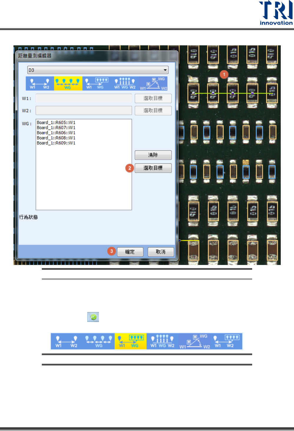 Test Research, Inc. TR7700Q E User Gu ide – S o f twar e 321 圖 509 :距離量測 – 單一元件 到多個 元件 距離量測 設定步驟 步驟 1. 在全圖模式或者原圖模 式上選擇一個元件 。 步驟 2. 點選 [ 距離編輯器 ] 中 W 1 欄位的 [ 選取目標 ] ,此時所選取的 元件會被套到欄位 裡。 步驟 3. 在全圖模式或者原圖模 式上再選擇另外多 個元件。 ( 使用 C…