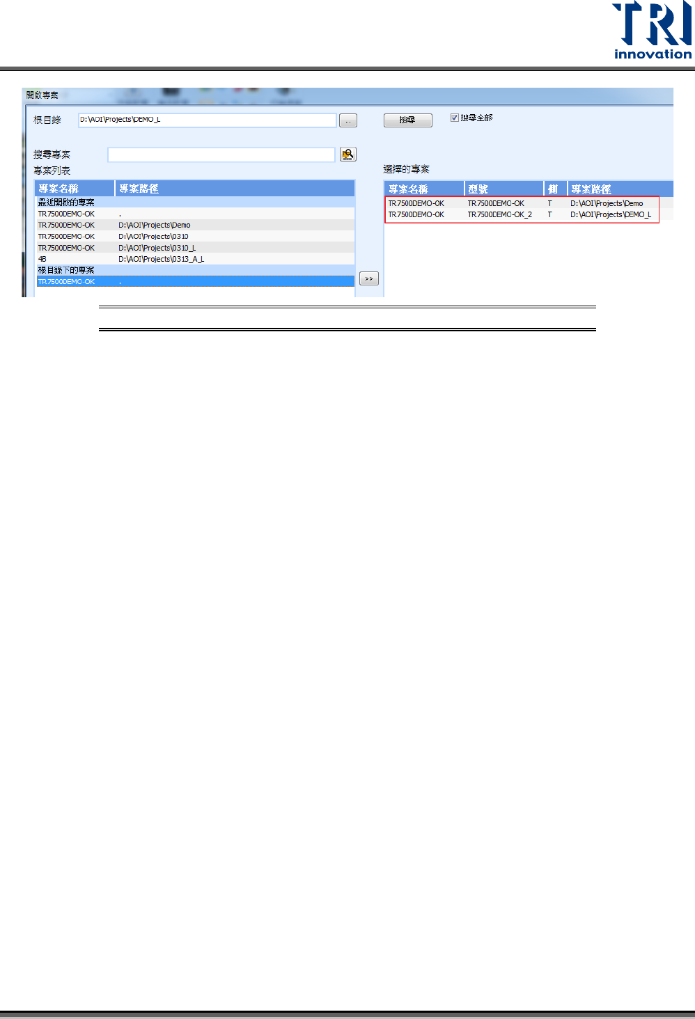 Test Research, Inc. TR7700Q E User Gu ide – S o f twar e 352 圖 552 :載入另一 半部的專案 步驟 8. 開啟左半部的專案程式, 進行一般專案編輯流程 ( 多連板展開、參 考作標定位、製作 對位 作標與元件資料庫編輯 ) ,完成後再進行 存檔。 圖 553 :進行另一 半部專案的 編輯 步驟 9. 在開啟專案視窗同時開 啟剛儲存的兩個專 案,即可進行兩段 式進板測試。