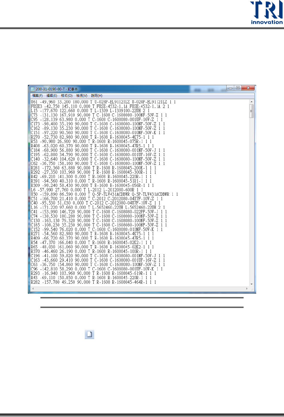 格式應該包含位號、X 與 Y 座標、角度、正反面以及封裝類型…等,如下圖所示。
