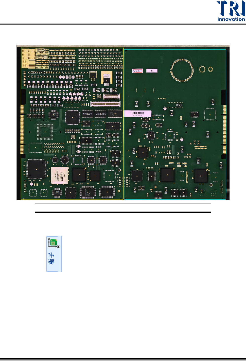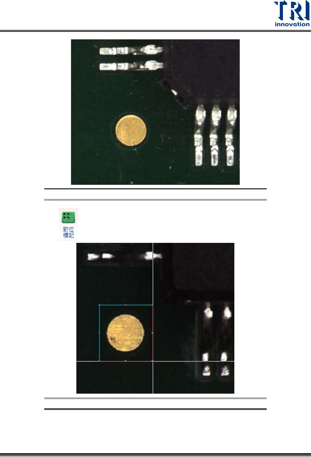 Test Research, Inc. TR7700Q E User Gu ide – S o f twar e 27 步驟 3. 直接在大圖上拖 曳板寬邊界到適當 的大小, 然後按下 [ 離開 ] 或者 大圖影像右上方的叉 叉來離開子板尺寸設定 介面 。 圖 38 :子板尺寸 設定 – 步驟 2 2.9 設定對位標記 步驟 1. 選擇 頁籤。 步驟 2. 在 大圖 上 點選滑鼠左鍵兩 下一個有定位座標 的位置,會進入到原 圖模式,如下…