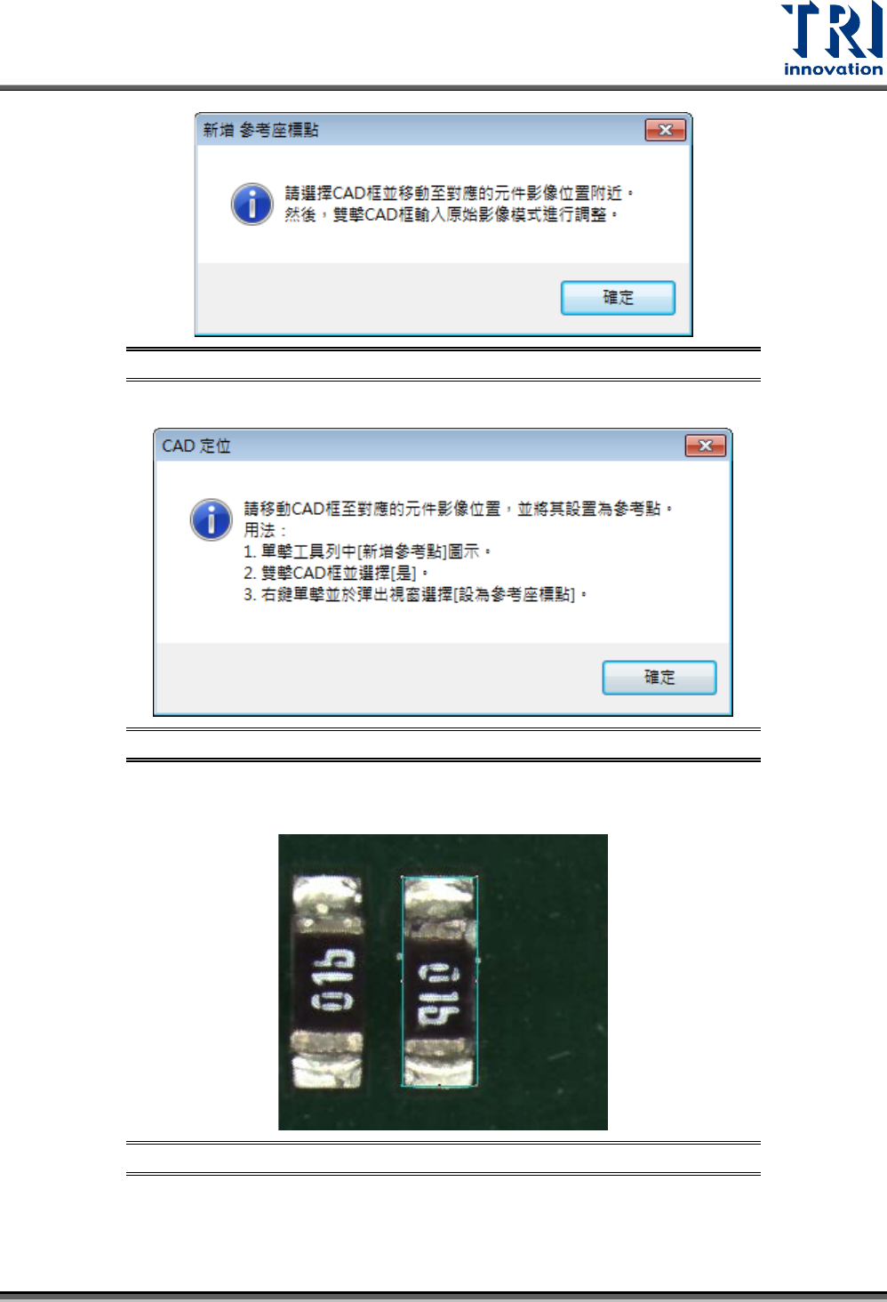 Test Research, Inc. TR7700Q E User Gu ide – S o f twar e 34 圖 53 :教程模式 – 設定參考 座標點引 導視窗 步驟 2. 依照指示,在全圖模式 上雙擊 CAD 框,會跳出如下圖的引導視窗 。按下 [ 確定 ] 來繼續。 圖 54 :教程模式 – 新增參考 座標點方 式引導視窗 步驟 3. 在原圖模式下,將 CAD 框移動到相對應元件位 置並調整框大小, 使其包含元件與悍 盤…