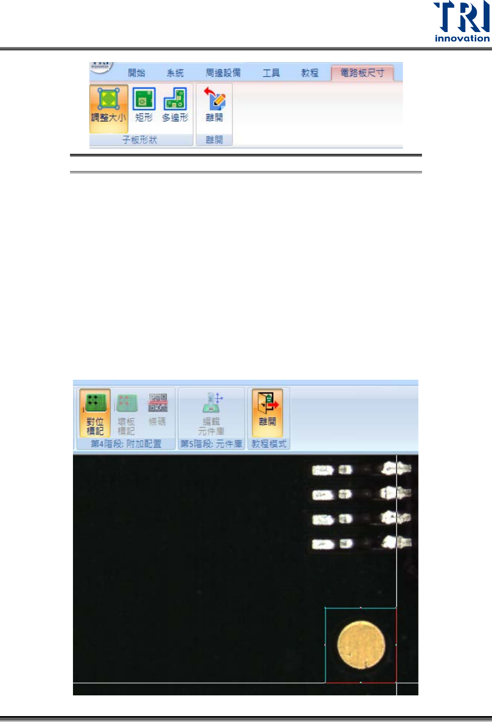 Test Research, Inc. TR7700Q E User Gu ide – S o f twar e 38 圖 62 :教程模式 – 新增對位 標記 步驟 3. 選擇按下 “ 確定 ” 來新增 第一個對位標記。此視窗 的詳細說明請參閱 5.3.8.1 。 圖 63 :教程模式 – 設定對位 標記視窗 步驟 4. 重複步驟 1 到 3 來新增另外一個對 位標記。 步驟 5. 當新增了兩個對位標記後 ,系統會跳出引導視窗 詢問是…