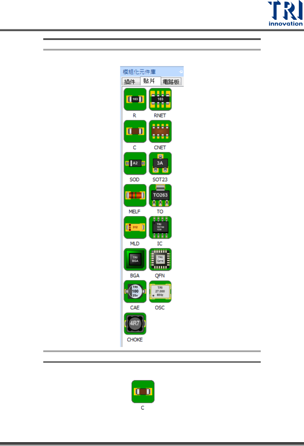 Test Research, Inc. TR7700Q E User Gu ide – S o f twar e 42 圖 66 :編輯元件 資料庫 – 晶片 (Chip) 元件 – 調整 C AD 方格 與元件本體 大小相符 步驟 3. 點選 ” 模組化資 料庫 ” 頁籤,會跳出 如下圖的視窗。 圖 67 :模組化資 料庫 步驟 4. 選擇與原圖中元 件相對應的元件圖 式。以範例來說 ,原圖中的元件為晶片 電容,所 以我們需選擇其對應…