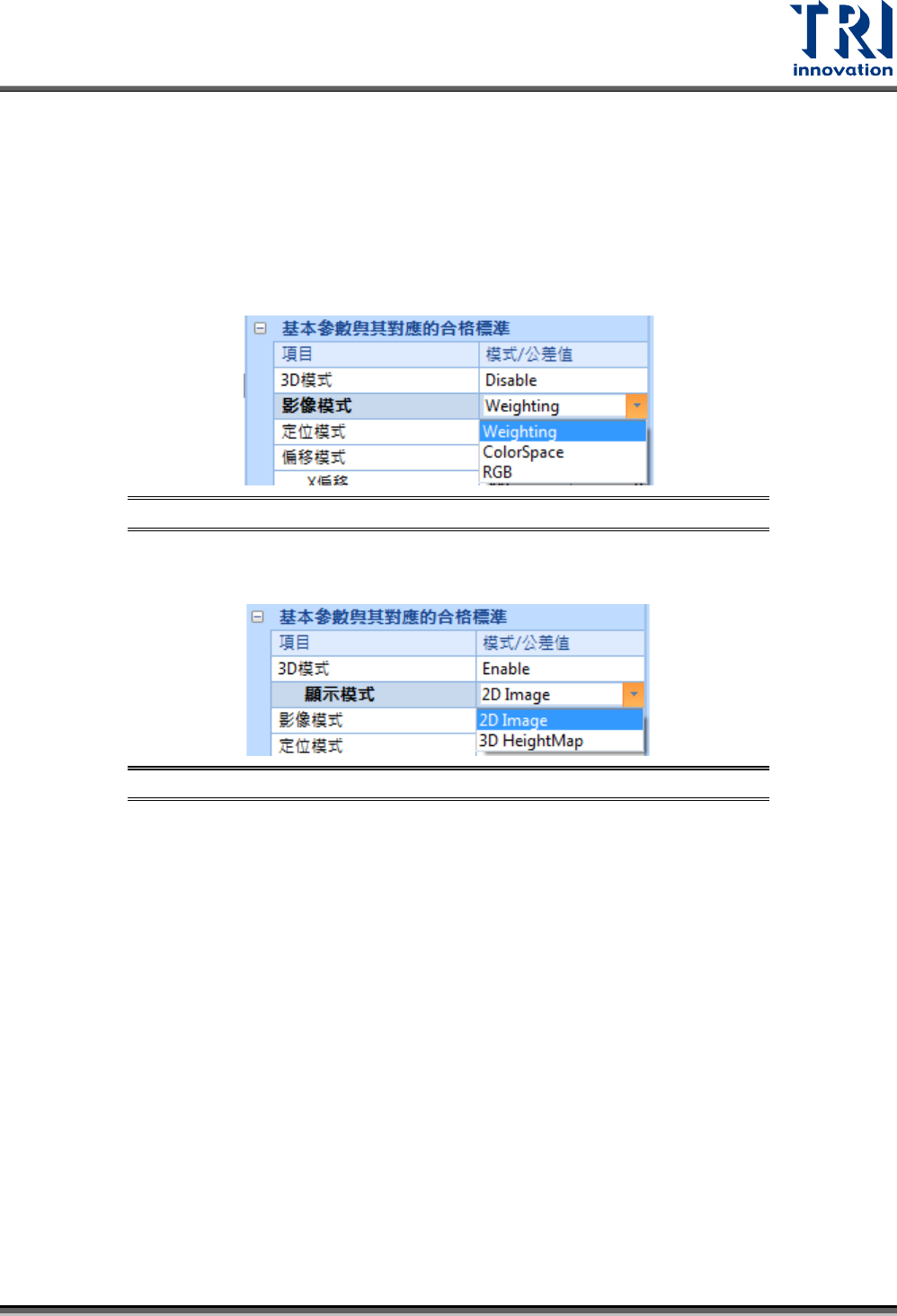 (僅限有 3D 雷射或者條紋光機種使用)。2D 模式包含權重法(Weighting)、色彩空間法(Color