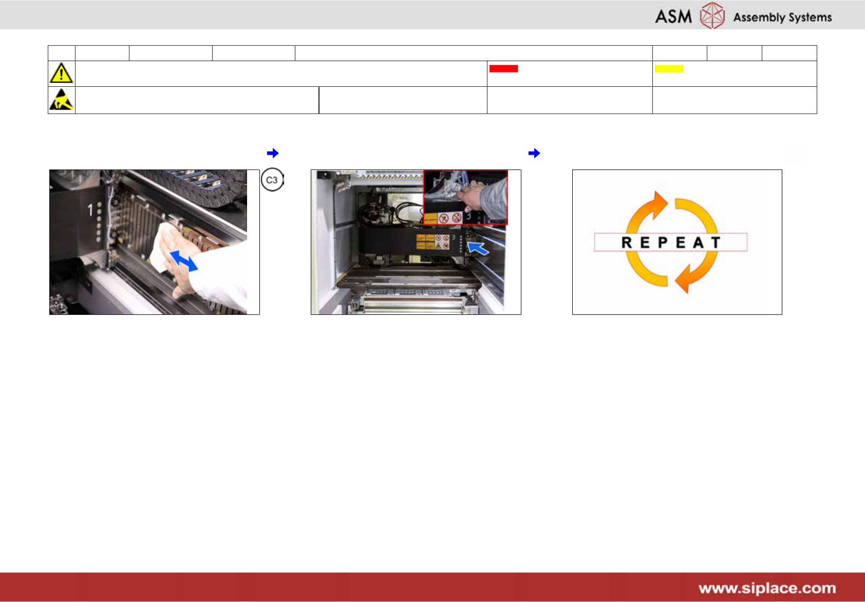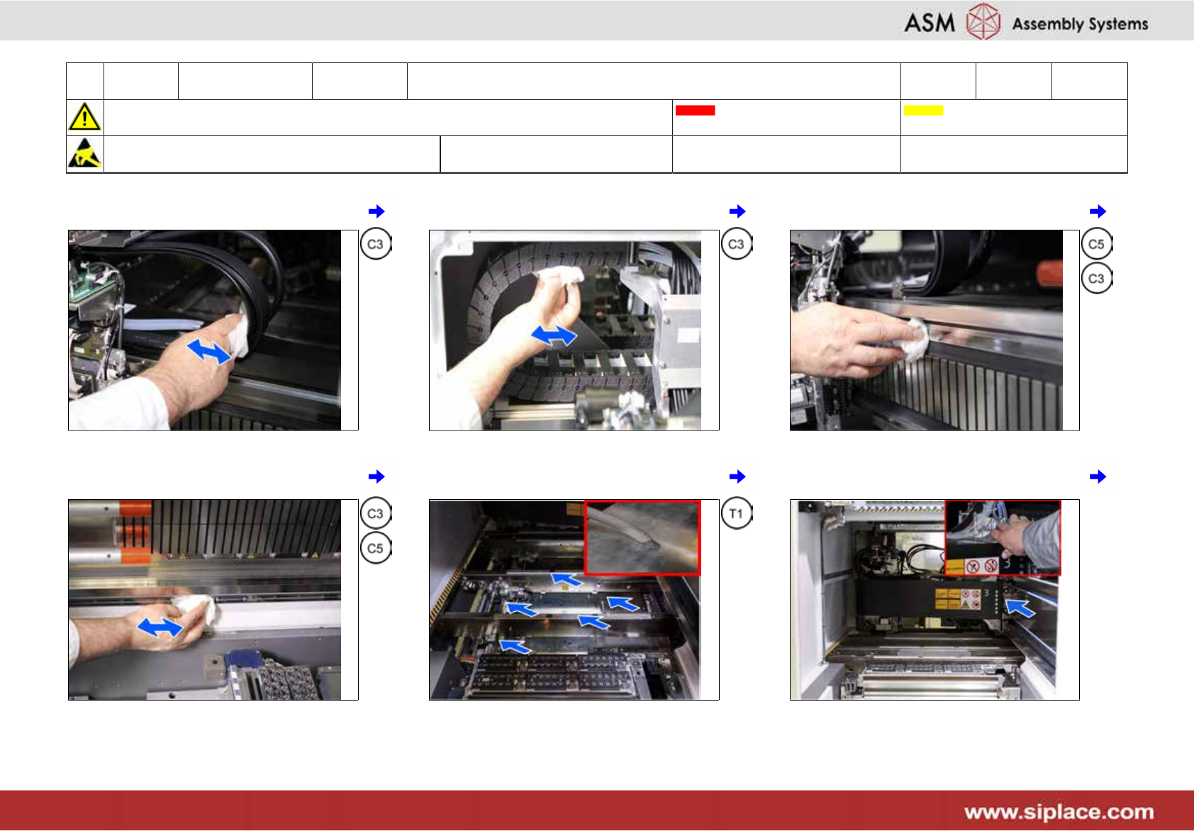 9 每三个月 X_系列 S 悬臂/传送导 轨 ****************** 8分钟 1/2 注意开始维护前,请参阅用户手册中的安全说明 贴片机状态 关闭 传送系统空 注意!遵守防静电守则 工具: T1 易损件: 耗材: C3、C5 1 清洁悬臂 1/3 (2/4) 上 X-轴的悬臂电缆 2 清洁悬臂 1/3 (2/4) 上 Y 轴的悬臂电缆 3 清洁悬臂 1/3 (2/4) 上的 X 轴刻度 4 清洁悬臂 1/3 (2/4…