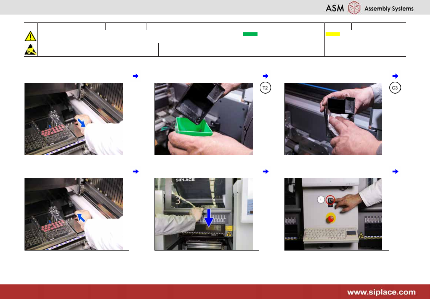 14 每三个月 X_系列 S 校准 **C&P20P 14分钟 6/7 注意开始维护前,请参阅用户手册中的安全说明 贴片机状态开启 传送系统空 注意!遵守防静电守则 工具: T2、T4 易损件: 耗材: C3 31 移出抛料仓 32 清空抛料仓 33 清洁抛料仓 34 插入抛料仓 35 关闭保护盖 36 按下“Start(启动)”按钮 (1)
