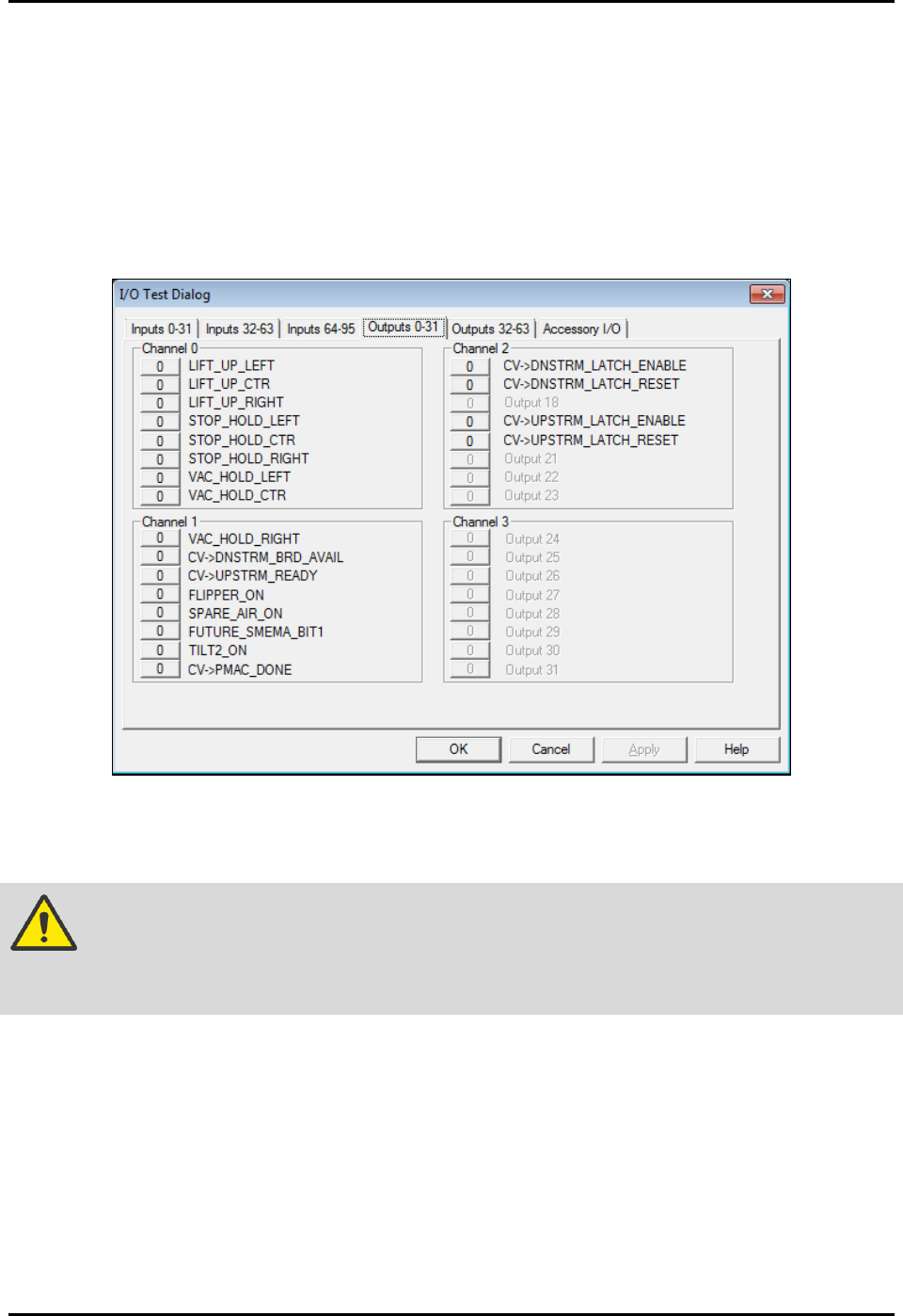 2. Select the tab labeled “Outputs 0-31” and locate the lift output buttons (Figure 5-41) for the
