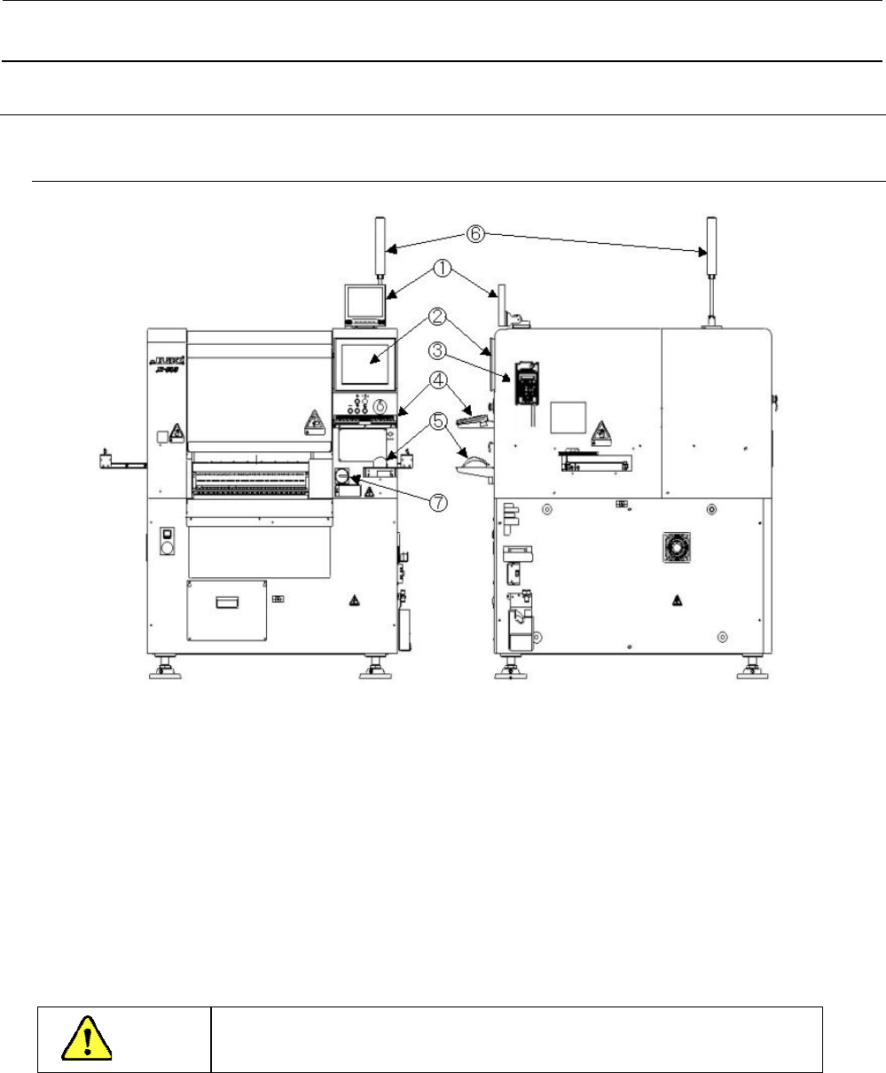 Rev. 1.0 安装要领书 1. 基本构成和各部分的名称 1-1. JX-200 图 1-1-1 正面图 图 1-1-2 右侧面图 ① 视觉监视器 ⑤ 鼠标 ② 液晶显示器 ⑥ 信号灯(选购件) ③ HOD (选购件) ⑦ 主开关 ④ 键盘 注意 如果刚开封就发现机器有故障部位、 缺少零件等, 请拍下照片并记录下来。 索赔处理时可能需要提供。 1