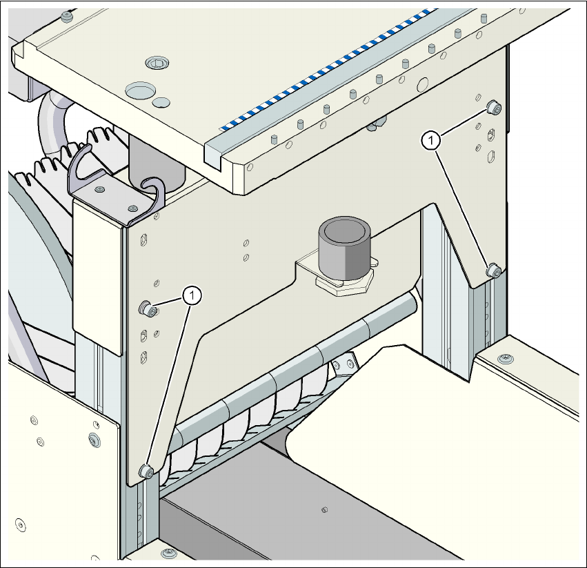 ユーザーマニュアル SIPLACE D4 4 据付および委託作業 ソフトウエアバージョン SR.605.xx 以降 2008 年 7 月版 4.4 部品トロリーを PCB 搬送高さに合わせる 185 4.4.5 900 mm の PCB コンベヤ高さ 4 図 4.4 - 4 部品トロリー : PCB コンベヤ高さ 90 0 mm - 背面図、キャップボルトおよびチ ェック穴の位置 (1) キャップボルト M6x12 およびワッシャ ( …