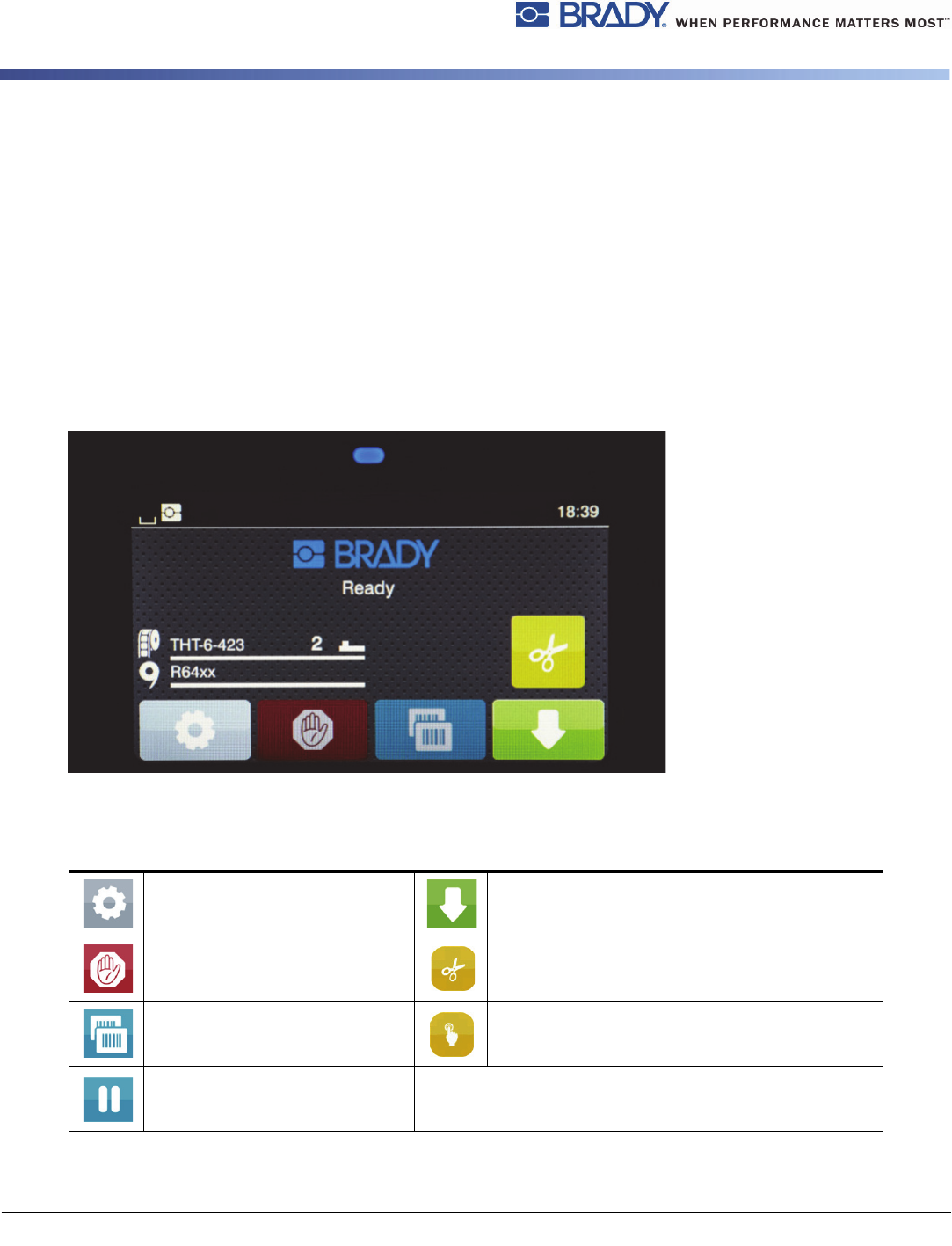 BradyPrinter i5100 11 主页屏幕顶部的信息图标 图标将根据配置和 打印情况而显示。 主页屏幕上的 IP 打印耗材信息 以滴落的形式显示当前数据传输 灰色:已安装蓝牙适配器,白 色:蓝牙连接处 于活动状态 正在 Brady 模式下运行( IP 打印模式) WiFi 连接处于活动状态 以白色圆弧数显示 WiFi 强度 正在标准模式下运行 以太网连接处于活动状态 Save data stream ( 保存数据流 ) 功能处…