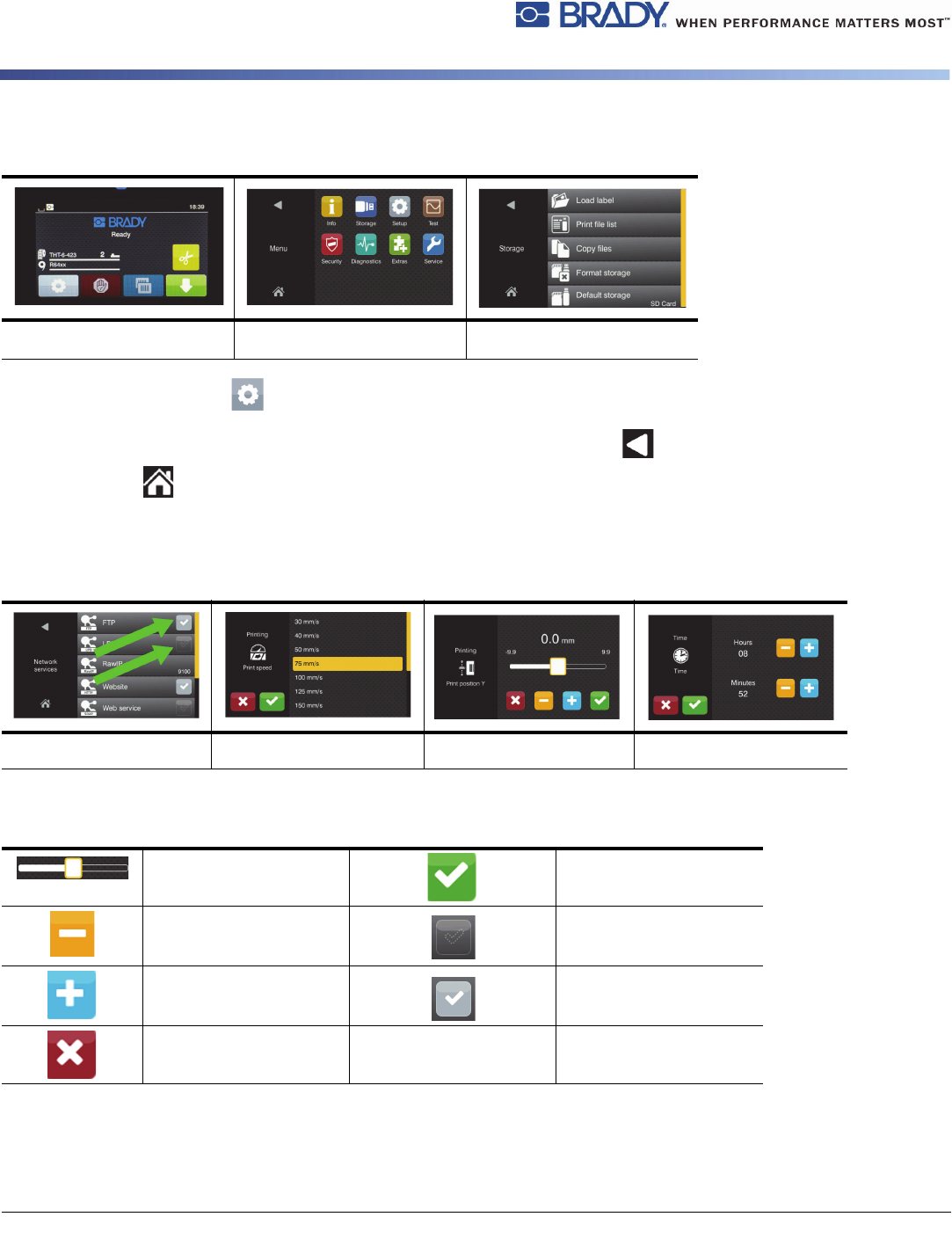 12 BradyPrinter i5100 基本菜单导航 要打开菜单,则选 择开始屏幕上的 按钮。 在选择级中选择一 个图标。多个图标 具有进一步的子菜 单。要从当前级返 回到上一级,则选 择 。 要离开菜单,则选 择 。 继续选择图标,直 至到达所需的功能 设置为止。 开始一个功能,或 者选择一个功能进 行进一步设置。可 能的设置取决于功 能类型: 用于功能设置的按 钮 开始级 选择级 设置 / 功能级 逻辑功能 选择功能 数字设置功…