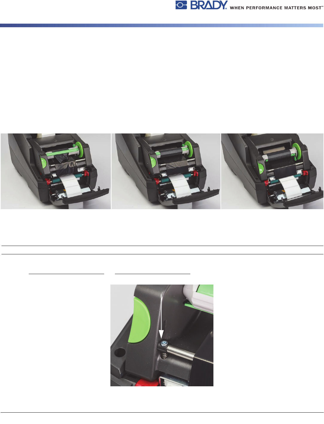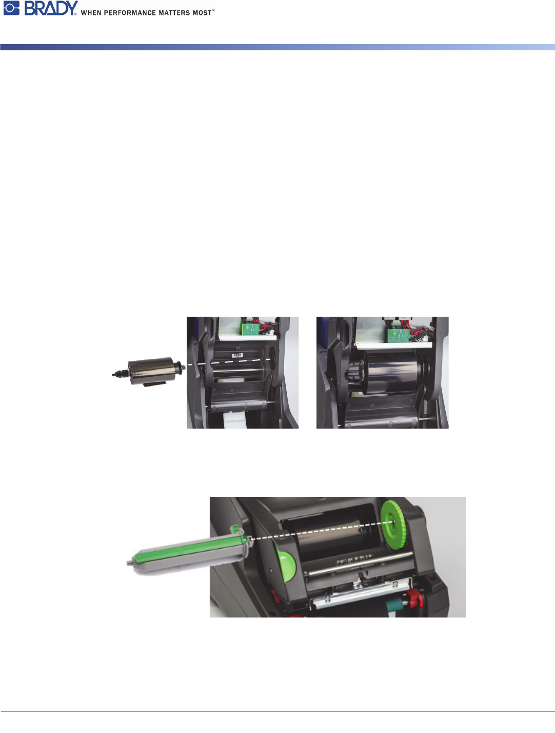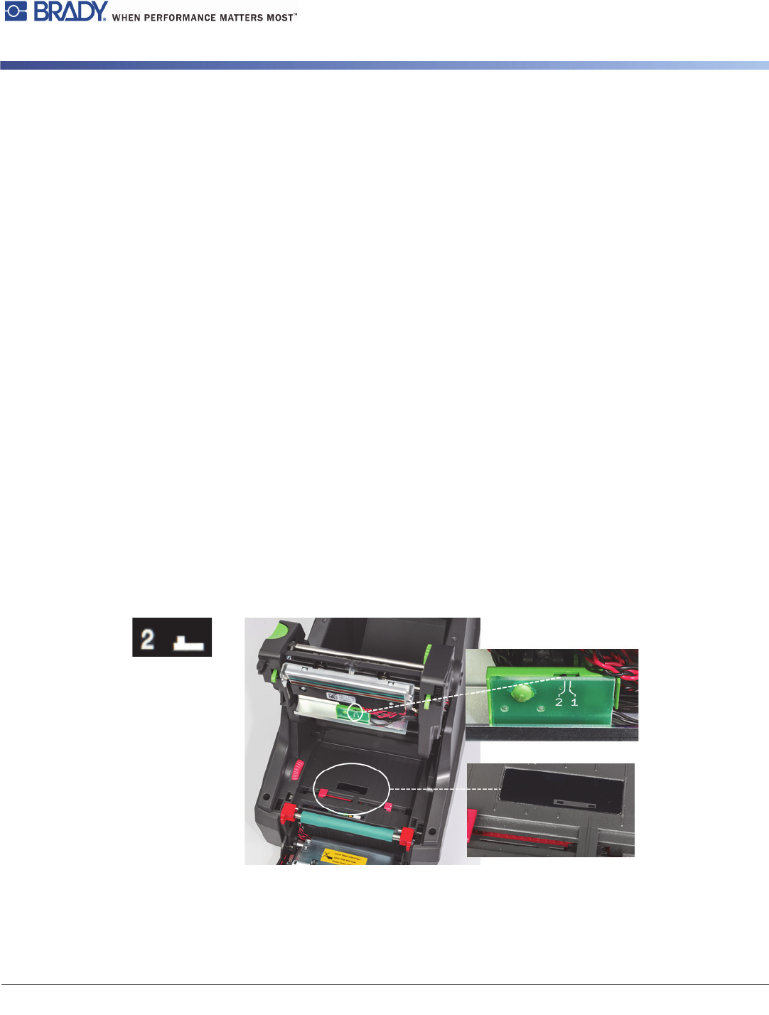 22 BradyPrinter i5100 绕着打印模块将色带穿装到卷紧轴上 1. 朝上穿装色带的松弛端 , 使其穿过保持在银色头部和银色圆棒外的打印模块前部 , 然后穿过卷紧轴的下方, 并向上穿过轴的背面 (参见图片)。 2. 将轴的长绿色定位器下方的色带前边缘从色带末端卷起约 2 英寸。 3. 将绿色轮朝您的方向转动几圈,直至色带拉紧、平滑并在展开银色头部和银色圆棒间展开为止。 4. 用拇指按压有纹理的锁闭点,直至其在两侧牢牢锁定就…
