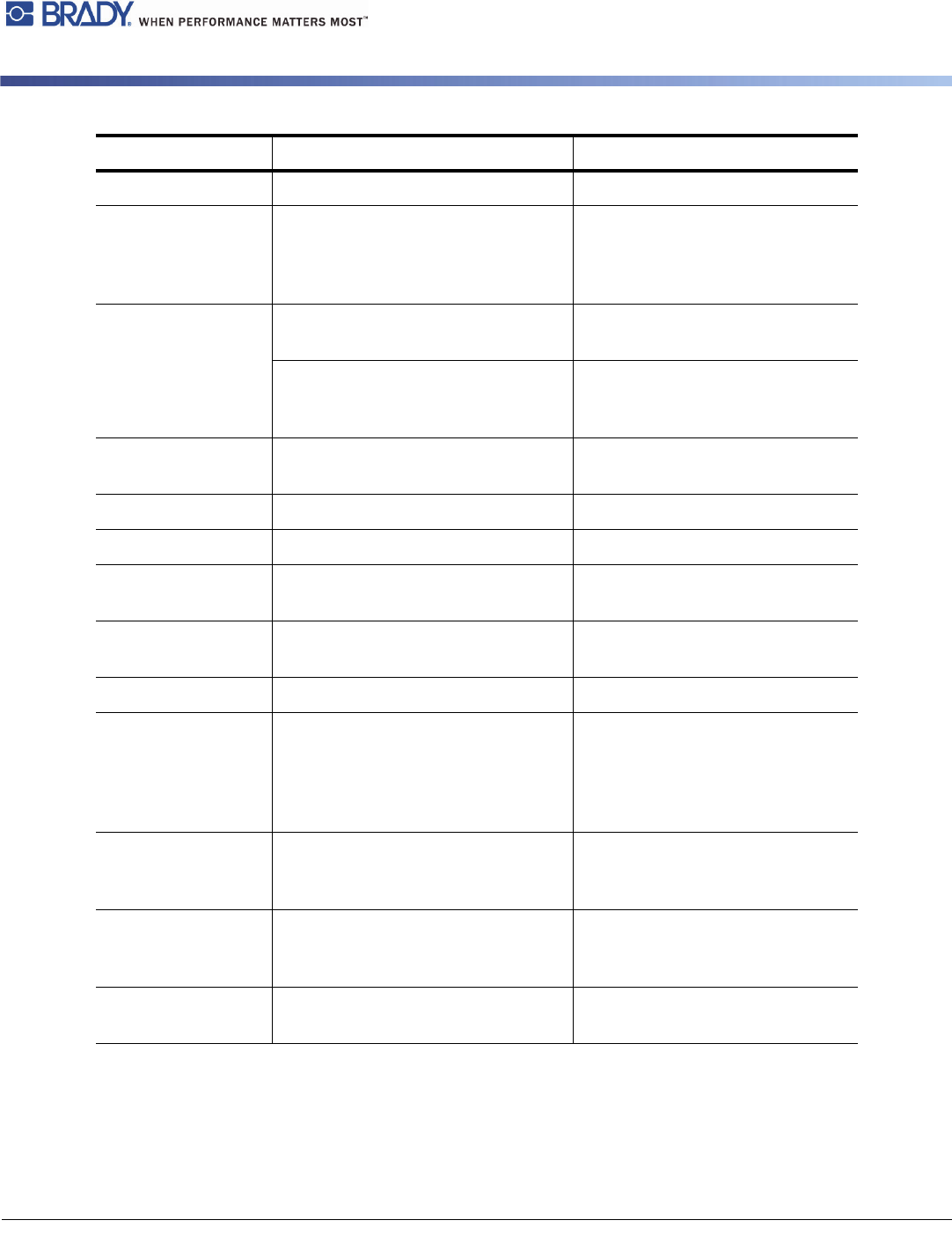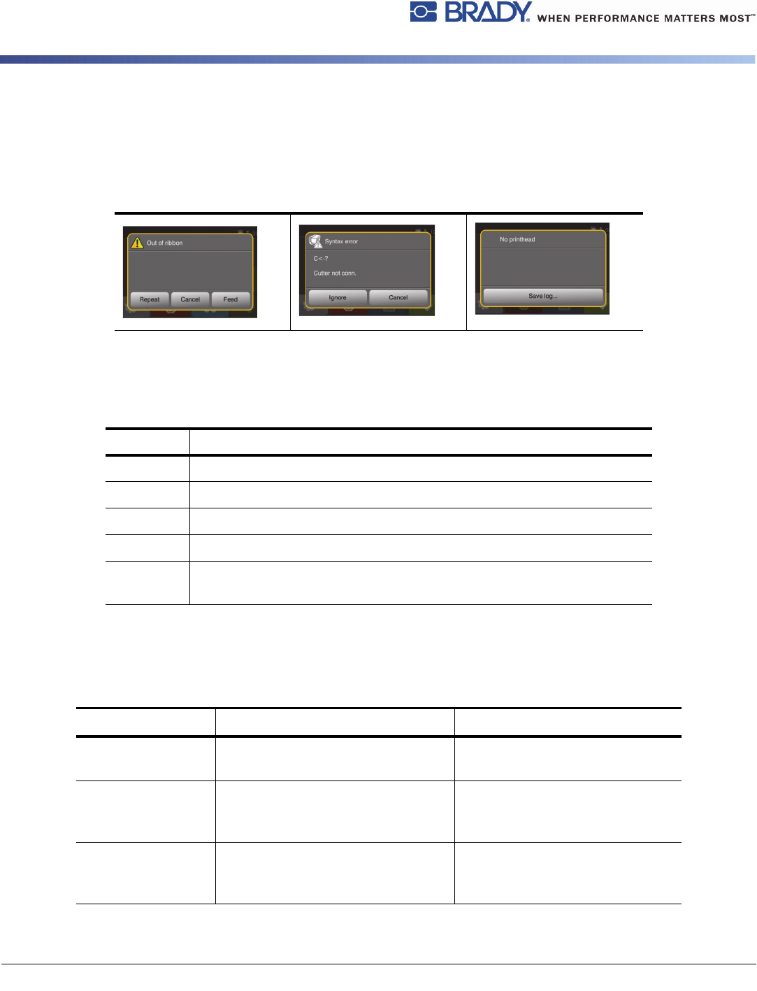 30 BradyPrinter i5100 9 • 故障排除 错误屏幕导航 出现的错误将显示 在显示屏上。 错误处理取决于错 误类型,请参阅 “ 带有补救方法的错 误消息列表 ” 第 30 页。 为在出现错误后能 够继续运行,显示 屏提供了以下可能 性: 带有补救方法的错误消息列表 按钮 工作状态 重复 清除错误原因后将继续执行打印作业。 取消 将取消打印作业。 送纸 将同步送纸。此后可继续执行打印作业。 忽略 将忽略错误消息。可能将以…