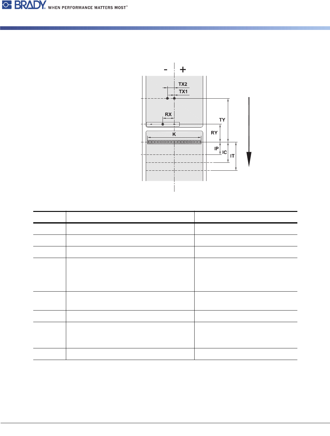 38 BradyPrinter i5100 反射标记尺寸( “ 黑色标记 ” ) 标注 描述 外形尺寸 A 标签距离 (>2 mm) L 反射标记的宽度 (>5 mm) M 反射标记的高度 (3 - 10 mm) X 标记到纸道中间的距离,用于反射传感器识别 ( -56 至最高 +10 mm ) Z 虚拟标签前边缘到实际标签前边缘的距离 > 调整软件设置 0 至最高 A/ 建议: 0 • 反射标记必须在材 料的背面(画…