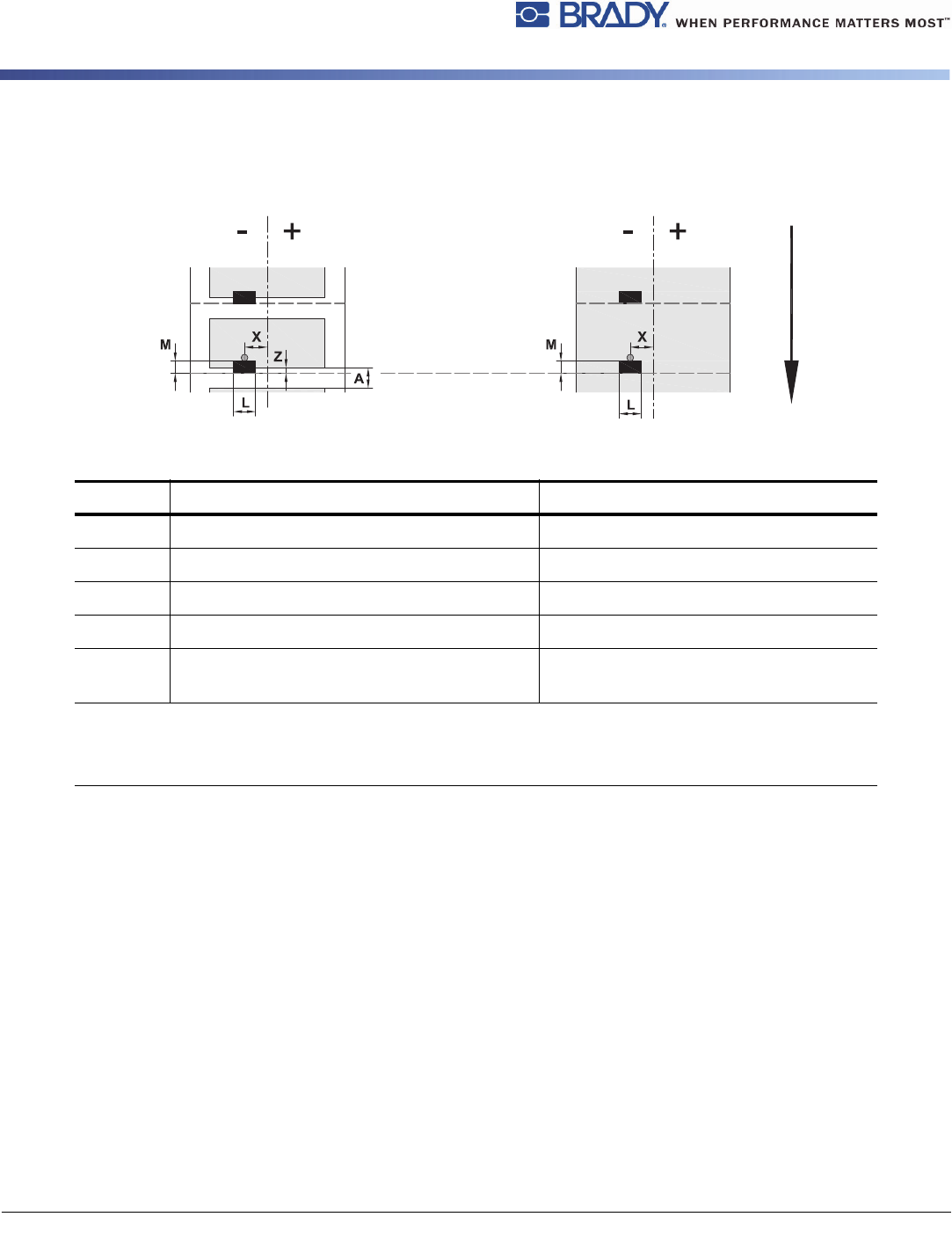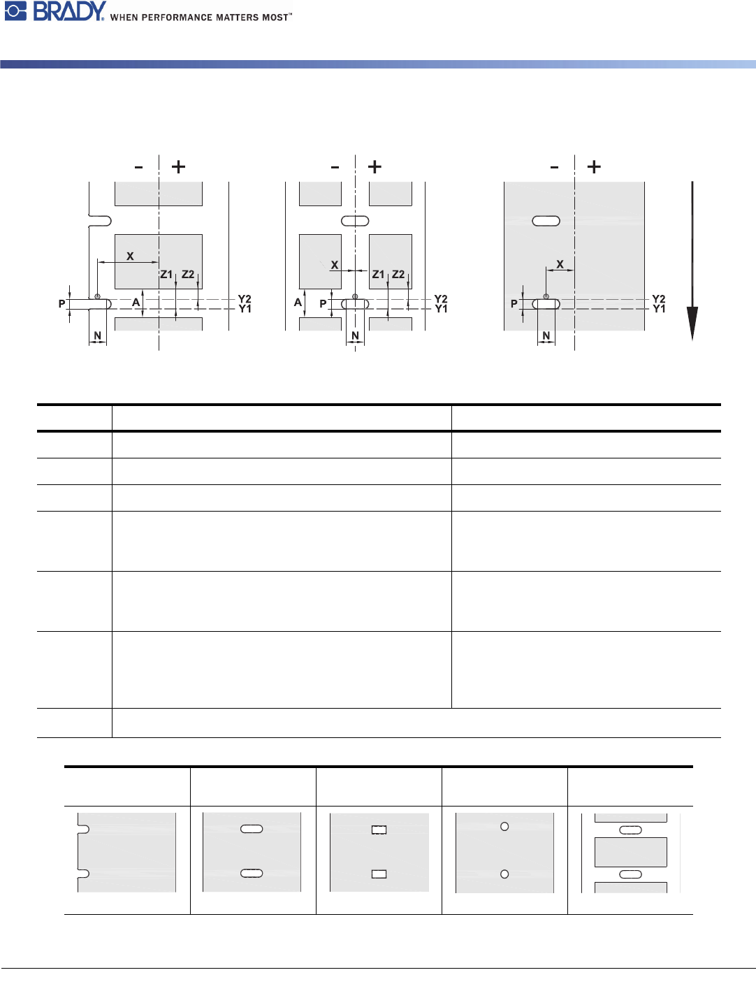 BradyPrinter i5100 39 槽口 / 切口尺寸 标注 描述 外形尺寸 A 标签距离 (>2 mm) N 切口标记宽度 (>5 mm) P 切口标记高度 (2 - 10 mm) X 标记到纸道中间的距离 用于间隙传感器识别 用于反射传感器识别 ( -10 或 0 mm ) ( -56 至最高 +10 mm ) Y1 Y2 传感器识别的虚拟标签前边缘 通过反射传感器识别 (1) 通过间隙传感器识别 前边缘切口 后…