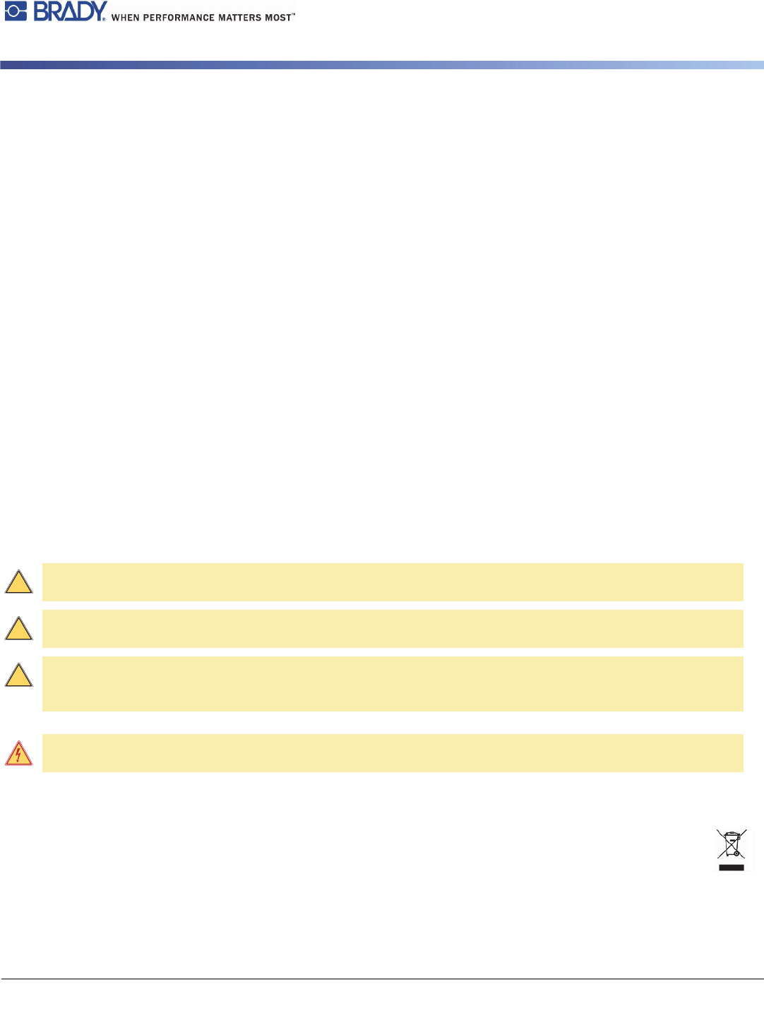 BradyPrinter i5100 是按照适用标准和公认的安全规则加以设计和制造的。但在使用过程中可能会对用户或第三方的生命和肢体带来危