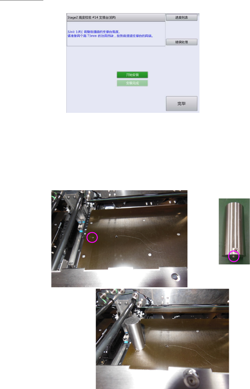 第 2 章 操作顺序书 2- 3. 校准 支承台(前 R ) Z 轴软件极限的 确认 结束 后, 显示 如下 画面。 将 高度调 整用的 治具 块 安装 到前侧通道 。 1 触摸[开始安装]。 进行左右一次性 更换台车 上升、 前面护罩的锁定后 , XY 轴向待机 位置移动,传 送通道宽度 被调 整到能够安放 治具 块的宽度。 然后进行左右 一次性更换 台车下降、前面 护罩解除锁定 。 2 打开前面护罩,将高度 7 3 mm 的治具块放…