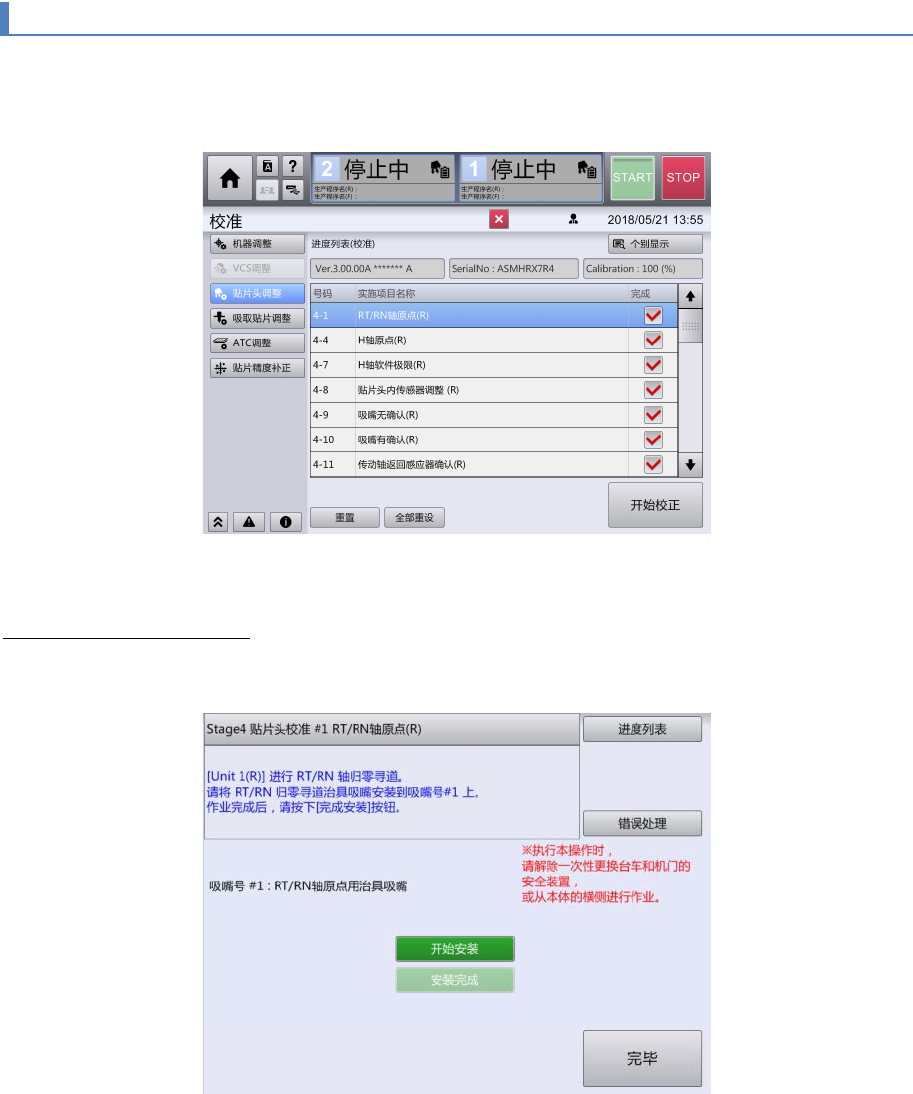 Stage2 的处理完成后,显示如下画面。首先,为了确定右侧装置贴装头 RT 轴/RN 轴的原点,进行治