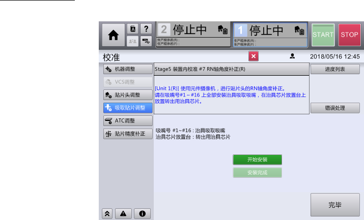 第 2 章 操作顺序书 2- 3. 校准 RN 轴角度补正 1 触摸[开始安装]。 进行左右一次性 更换台车上升 、前面护罩的 锁定后,贴 装头向安装位置 移动, RT 轴的 转塔向吸 嘴号 #1 的位置旋转。 然后进行左右 一次性更换台 车下降、前面护 罩解除锁定。 2 将治具吸 嘴安装到 装置 的吸嘴号 #1 ~ 16 上,把玻 璃芯片 (7 x7) 放到治具 芯片安置 台上。 ※如前一次校准 时安装的吸嘴 、玻璃芯片保 持原状未卸…