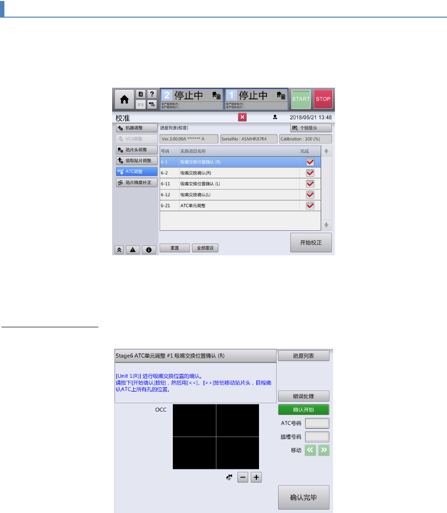 第 2 章 操作顺序书 2- 3. 校准 2 以目视确认 OCC 图像正确地出现在 AT C 圆孔位置的中央,。 触摸 / 可调整 摄像机 照明 的亮度。 触摸 可使槽号提升 1 位。槽号到 20 时,吸嘴盒 编号 变为 2 。 3 用 OCC 图像确认1、 2 号吸嘴盒之全部 #1 ~ #2 0 槽的圆孔位置。 4 触摸[确认 OK ]。 117