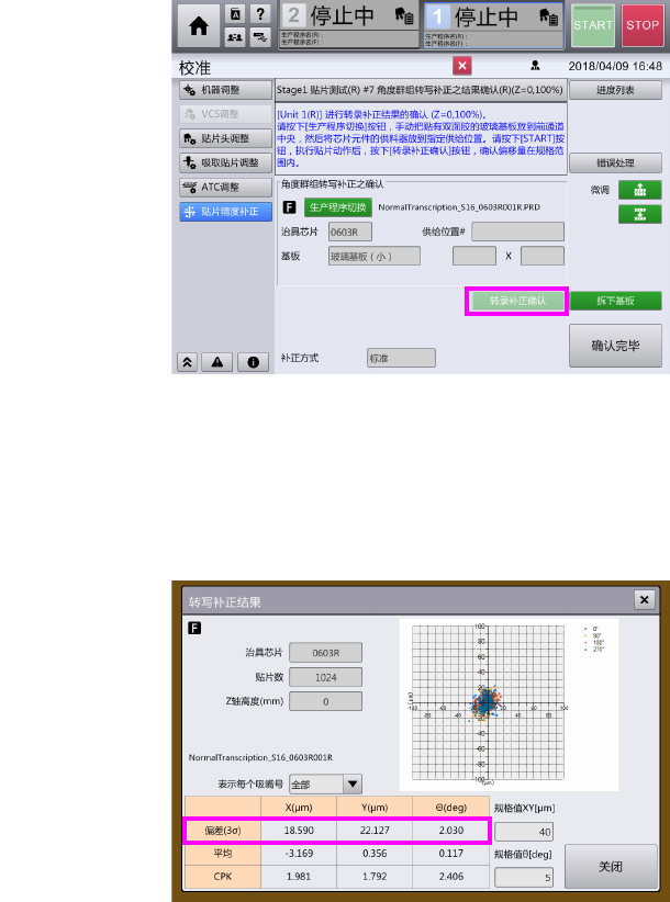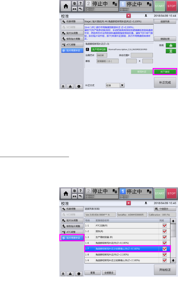 第 2 章 操作顺序书 2- 3. 校准 8 转写补正结束后,按[拆下基板]。 9 按[恢复]。 10 机器运行完成后,请打开前护罩,拆下玻璃基板。 11 按[补正完成]。 角度群组转写补正结果确认 确认补正的结果 。 1 选择[角度群组转写补正结果确认( Z=0 , 1 00% )]。 2 按[ 个别显示 ]。请按照与角度群组转写补正相同的步骤进行贴装。 127