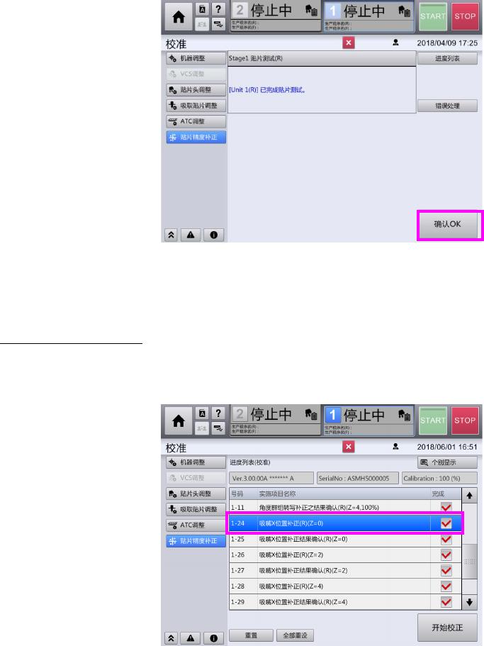 第 2 章 操作顺序书 2- 3. 校准 10 按[确认 OK ]。 11 请按照相同的步骤分别执行 “ Z=2 ,100% 、 Z=4 ,10 0%” 的角度群组转写补正及确认。 吸嘴位置 X 成分补正 1 选择[吸嘴 X 位置补正 Z = 0 ]。 2 按[个别显示]。 129