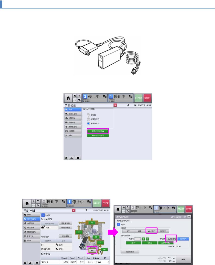 第 2 章 操作顺序书 2- 4. 维护 2-4- 4 . 测定喷气流量 1 接通流量计的电源,进行约 1 分钟的预热。 请确认 预热 后 流量 计的显示为 “ ±0.009 以下 ” 。 2 选择手动控制>保养 “装置的前方”,触摸“装置内作业开始”。 3 触摸手动控制>贴片头控制 “ V AC ”。 在下一画面上触摸 “ 贴片时吹气 ” 。 150