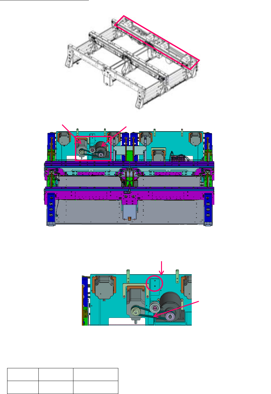 第 2 章 操作顺序书 2- 4. 维护 后侧 宽度调整正时皮带张力 ※如是单传送带 则无本作业。 1 松开空转皮带轮托架的固定螺丝 ×2 个,将空转皮带轮上下移动,要使张力符合规格值 并旋紧空转皮带轮托架固定螺丝 ×2 个。 (螺丝紧固扭矩: 2± 0.1N m ) < 张力规格值 > 50±10Nm < 张力测定计 设定值 > MASS SPAN W I DT H 150mm 空转皮带轮托架 固定螺丝 张力测…