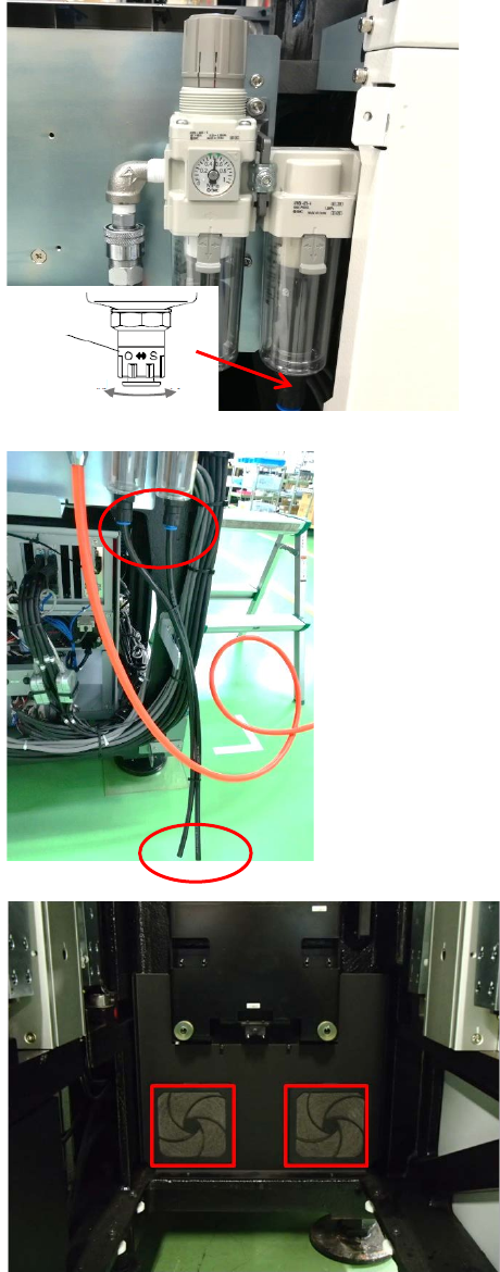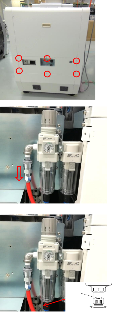 第 2 章 操作顺序书 2- 4. 维护 座架部 1 .过滤器调节器的检 查及更换 1-1 .用十字螺丝刀取下 螺丝,拆下背面的 护罩。 1-2 .请拔出位于右端的 调节器软管,切断 总气源的供给。 1-3 .使用后 2 年或圧力下降达 0.1M Pa 前 请更换过滤器滤芯。 可以自动泄液,也可以如右 图所示 用 手动开闭。 左:开 (O) 右:闭 (S) 泄液阀 开 闭 189