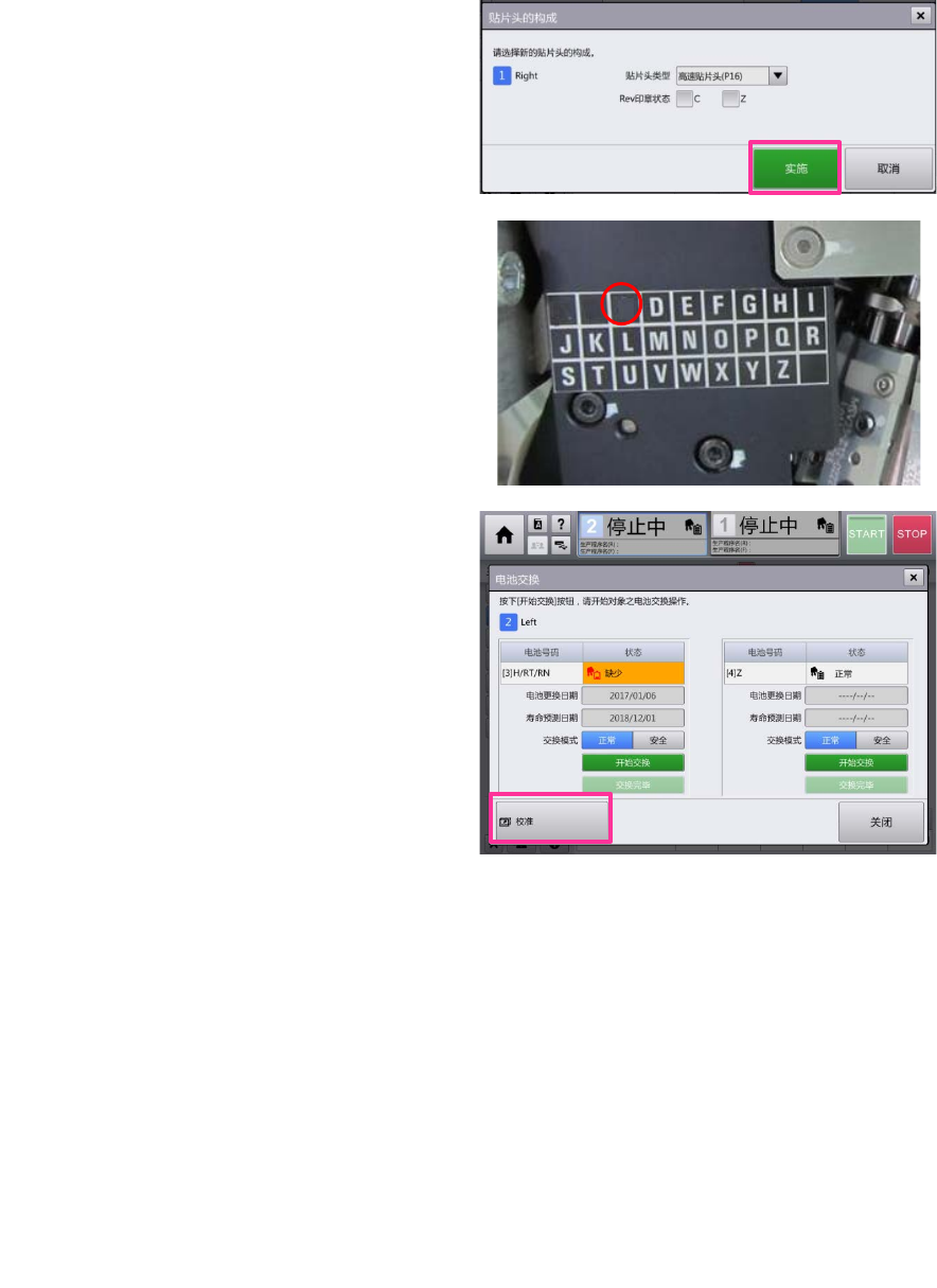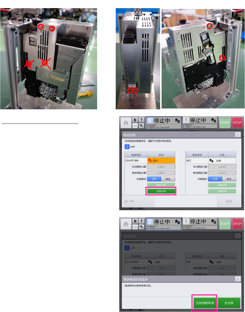 第 2 章 操作顺序书 2- 4. 维护 21 、将贴片头护盖复原 到原来的位置,固定 6 处的 螺丝。 22 、将贴片头安装到 装置 上之后, 在电池 交(更)换对话框中触摸 [ 交( 更)换 完毕 ] 按钮,完成电池交(更) 换。 触摸 [ 交(更)换完毕 ] 按钮后, 左右的 统一更换台车将上升,安全护盖 即被锁 紧。 23 、在前项中触摸 [ 交( 更)换完毕 ] 按 钮,即显示右图的 [ 更换电池状 态选 择 ] 对话框。 触…