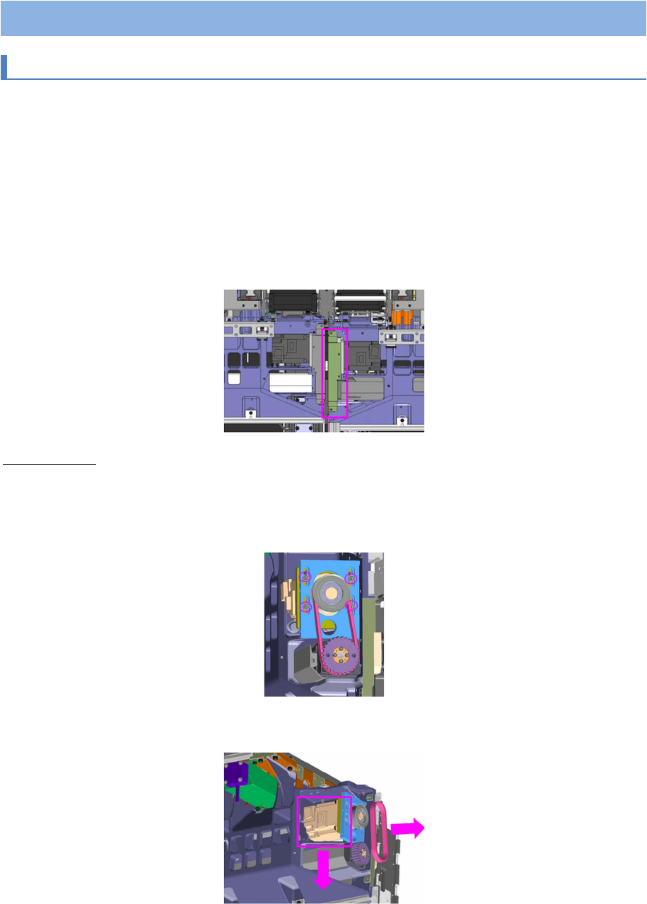 第 2 章 操作顺序书 2- 5. 配件更换 2- 5. 配件更换 2-5- 1 . 更换 X 轴电动机 更换前的作业 1 把要更换电动机的装置的贴装头向里侧移动。 2 将本机电源置于 OFF 之后,把主断路器置于 OFF 。 3 拆下本机后侧上部的护罩。 4 拆下 X 轴皮带轮护罩。 电动机的拆卸 1 松开张紧板的安装螺丝( 4 处)。 螺丝不要拆下。 2 将电动机滑动到下面,拆下同步皮带。 206