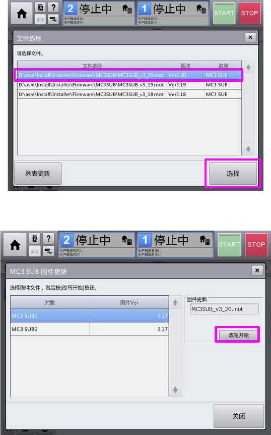 切换至 MC3 Sub 固件更新画面后,按下[改写开始]开始固件的更新。