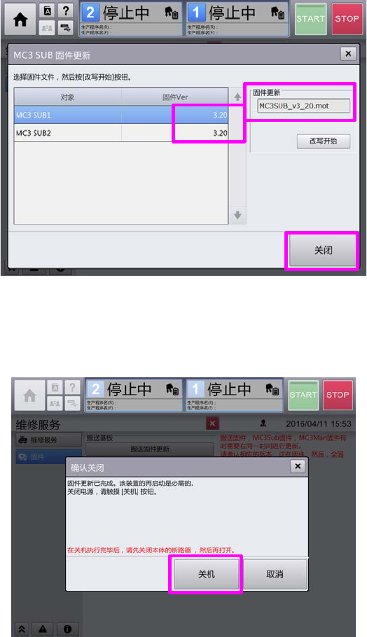 第 1 章 作 业顺 序书 1-6. MC3 Sub 固件的 版本升级 9. 正确完成固件的更新后,按下[关闭],关闭 MC3 Sub 固件更新对话框。 10. 点击关机确认对话框的「关机」按钮。 执行搬送固件更 新或 MC 3 Sub 固件更 新其中任意 之一时,为使 更新的版本有 效,需要执行 关机。 在固件画面要显 示其他的菜单 画面,则显示 以下的关机 确认对话框。请 点击「关机」 。 11. 将本机的电源 OFF 。 再启动后…