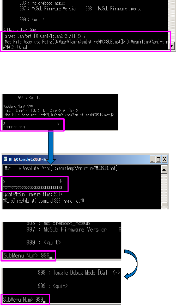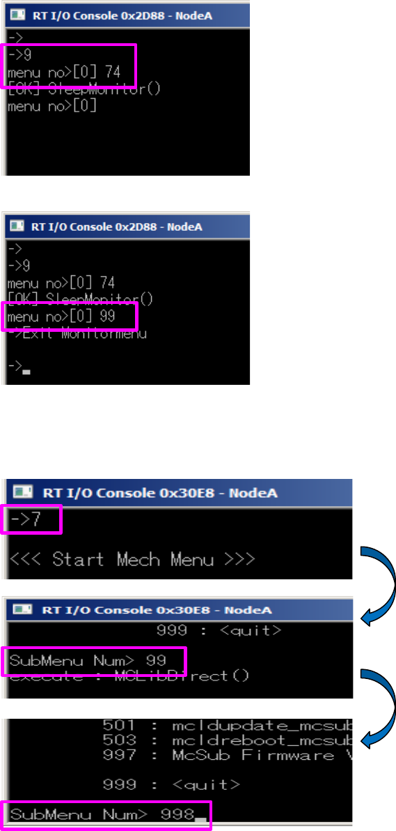 第 1 章 作 业顺 序书 1-6. MC3 Sub 固件的 版本升级 5. 将 M onitor 休眠。 1) 在排错控制台画 面中输入「 9 」 ( 按下 En ter) →「 74 」 ( 按下 Enter) ,将 Monitor 休眠。 2) 在排错控制台画 面中输入「 99 」 ( 按下 E nter) ,即 返回。 6. 进行版本升级。 1) 在排错控制台画 面中输入「 7 」 ( 按下 Enter) →「 99 」 ( 按…