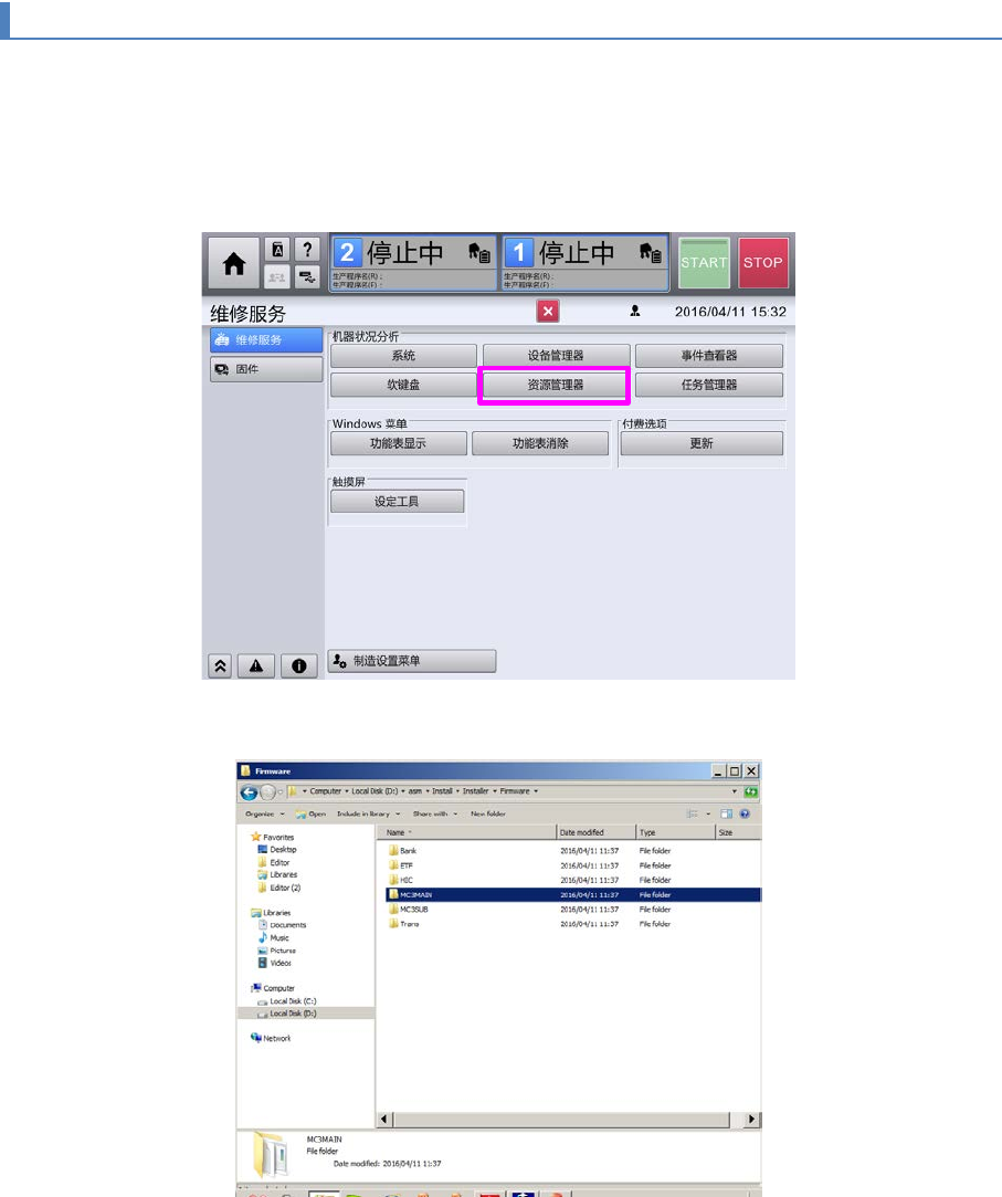 显示装置的资源管理器画面,将装置的以下文件夹(MC3 Main 的固件更新用文件及更