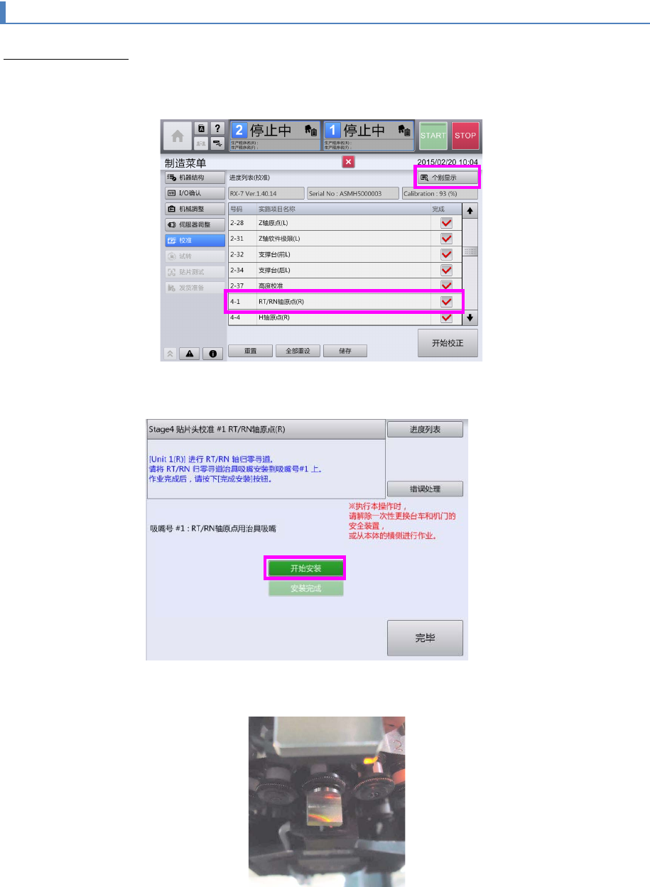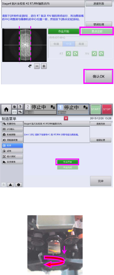 第 7 章 故障分析 7- 5. 贴片头单元原点消失时的恢复方法 4. 按[安装完成] 后,请按[ 完毕 ]。 5. 按[作 业开 始]。 6. 一边将 RT/RN 轴 的微调动作移 动速度切换为 低速、中速 、高速,一边用 RT 轴及 RN 轴 的旋转按 钮进行微调动作 移动 操作 调整,使 治具吸 嘴的 中心 位置与元件 摄像机 的 图像中心的位 置 一 致。 37