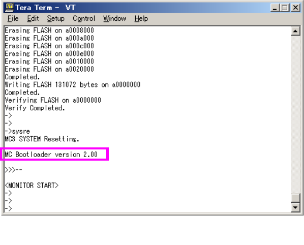 5) MC3 被复位,TeraTerm 的显示器画面显示现在安装的 MC3 引导装载程序的启动信息。