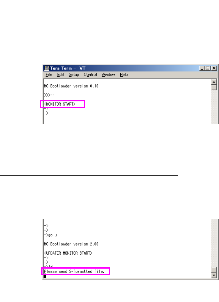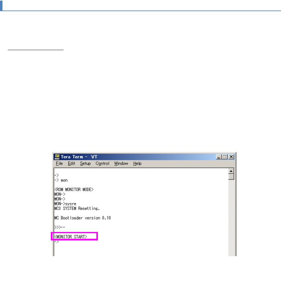 4) 在 TeraTerm 的显示器画面显示”<MONITOR START>”信息,启动 MC3 引导装载程序(图 17)。