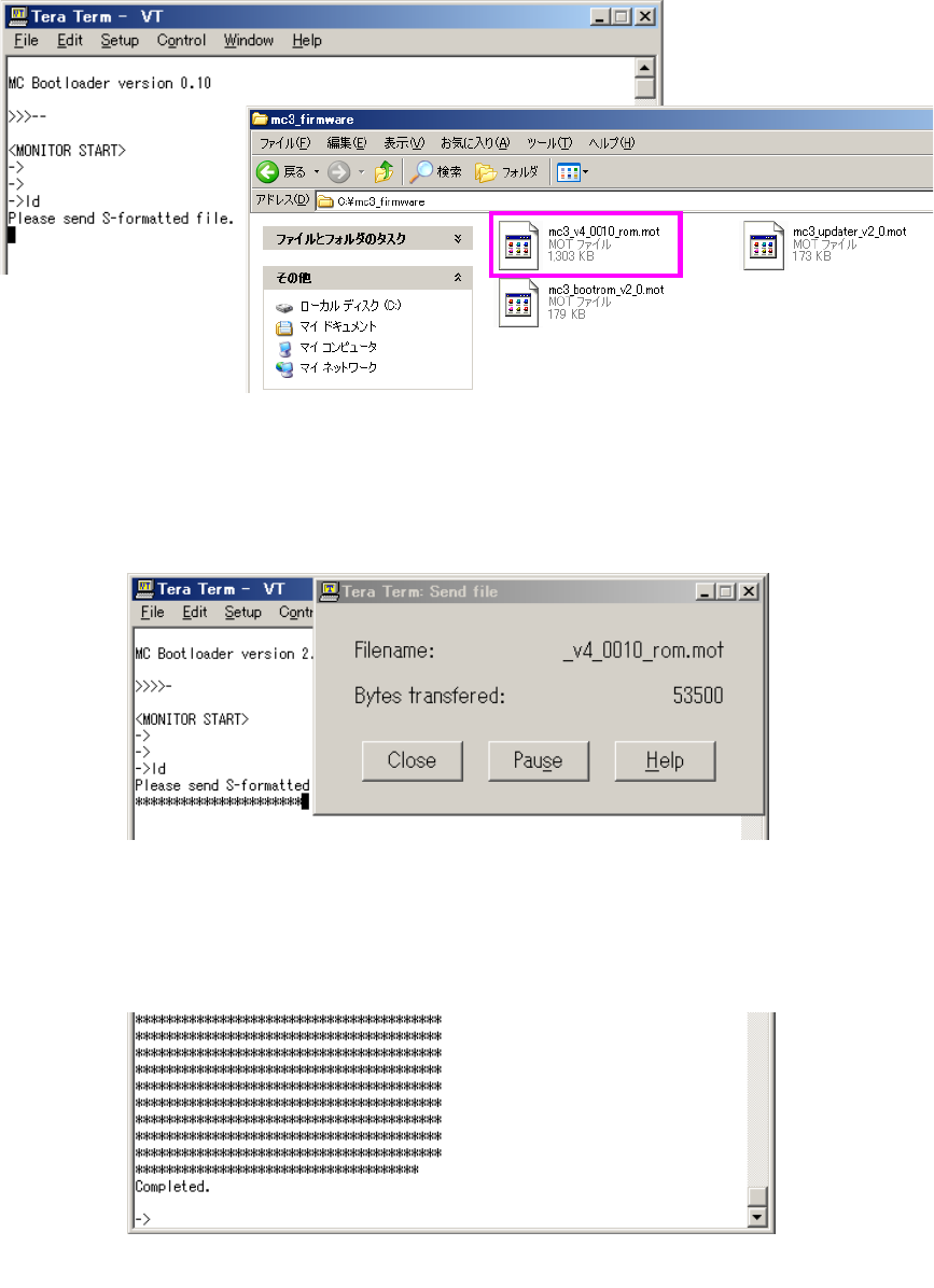 1) 将 MC3 应用程序的 mot 文件拖拽到 TeraTerm 的显示器画面。