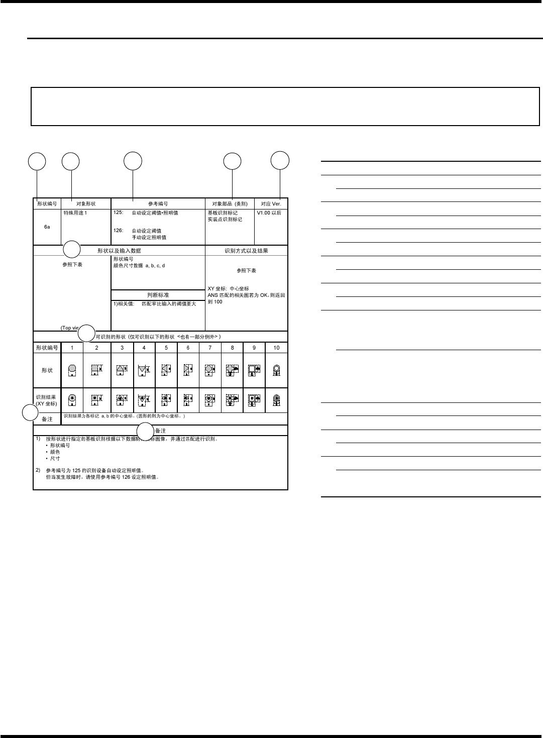 SP18P-L 程序手册 3.3 各种形状输入数据项目 Page 3-7 3.3 各种形状输入数据项目 轮廓识别的参考编号根据形状而定。 ( 参照 “3.2.1 轮廓识别形状一览 ”) 请参阅各形状对应的个别项目。个别项目的构成如图 3-1 所示。 说明 形状编号 记载形状编号。 对象形状 记载对象的外形形状项目。 参考编号 记载相应的参考编号。 对象元件 记载主要的对象元件。 对应 Ver. 记载可识别的版本。 …
