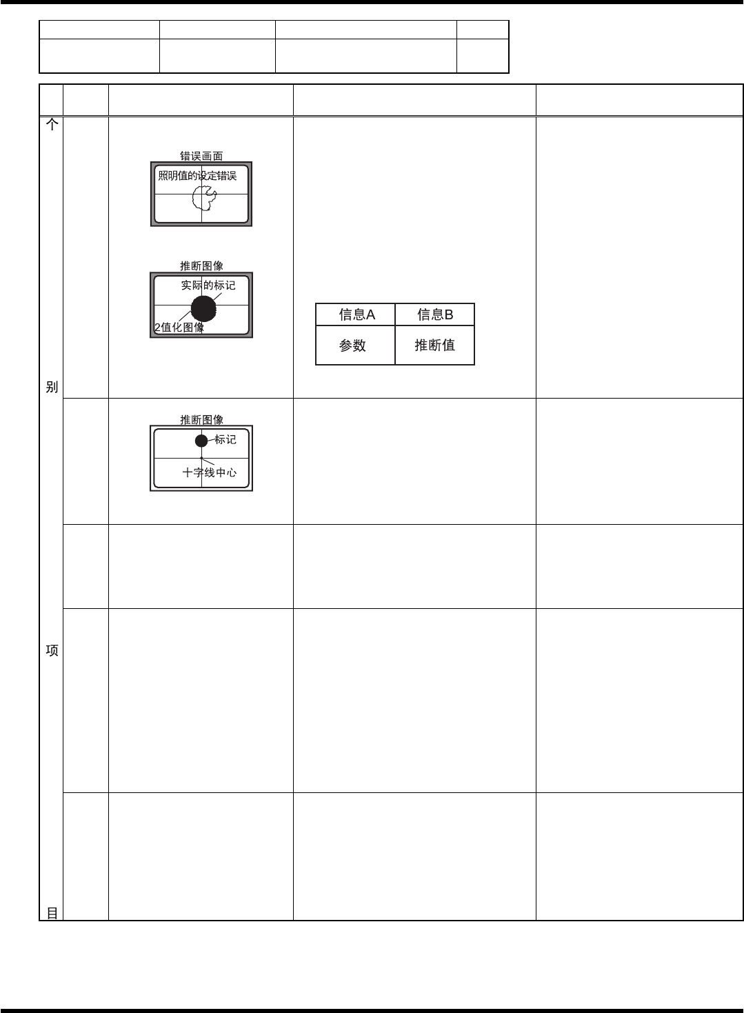 SP18P-L 程序手册 3.4 轮廓识别错误信息 Page 3-18 参考 No. 形状编号 类别 220, 226 6b 粘合剂涂敷量识别 1/1 编码 内容 原因 对策 1) 粘合剂不被涂敷。 15 无识别对象 EJP1A-C-PMA03- A01-00