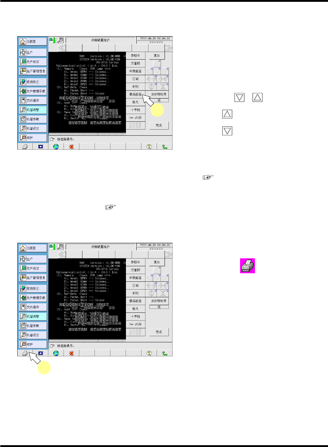SP18P-L 程序手册 3.5 识别装置维护 Page 3-23 3.5.2 错误画面显示 识别装置可以存储过去发生的识别错 误,并可在生产后确认错误 内容。请参阅参考对策。 1. 置于错误画面显示模式。 • 按 [ 错误画面 ] 。 2. 搜索要查明原因部分的错误画面。 • 用画面中的 , 切换画面。 画面键 : 下一画面 画面键 : 前一画面 [ 复位 ]: 错误信息的删除 • 请根据识别装置画面中的 “ 芯片编号 ” 、 “ 装…