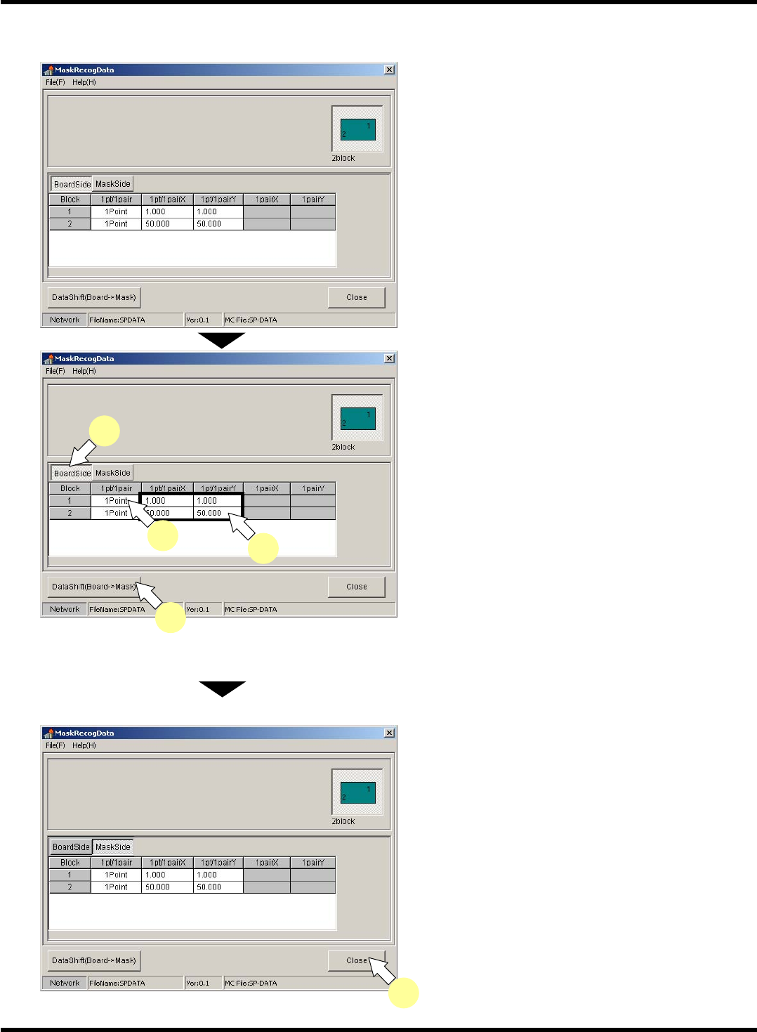 SP18P-L 程序手册 1.5 生产数据的编制 Pa ge 1- 24 1.5.6 全部示教数据 1. 关于全部示教数 据 进行全部示教功能的使 用·未使用的设定和网板识 别的坐标数据等的设定。 1. 全部示教功能 进行全部示教的使用· 未使用的设定。 如果设定为使用,对基 板识别将使用基板识别数据 ,对网板识别将使用全部示 教数据。 如果设定为未使用,对 基板识别将使用基板识别数 据,对网板识别将使用网板 识别数据。 2. 基板侧检…