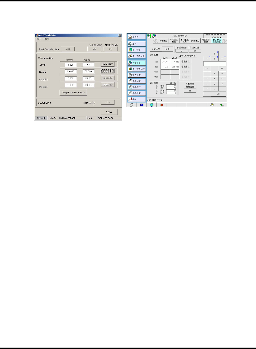 SP18P-L 程序手册 1.5 生产数据的编制 Page 1 -25 2. 全部示教数据的 数据编辑 1. BatchTeach function ( 全部示教功能 ) 设 为 ‘Use’ ( 使用 ) 。 2. 输入识别位置数据。 • 按 [CopyBoard RecogData] ( 基板识别数据拷 贝 ) ,复制以基板识别数据 输入的坐标。 3. Data Modi fy ( 数据变更 ) 设为 ‘Yes’ ( 有 ) 。 EJ…